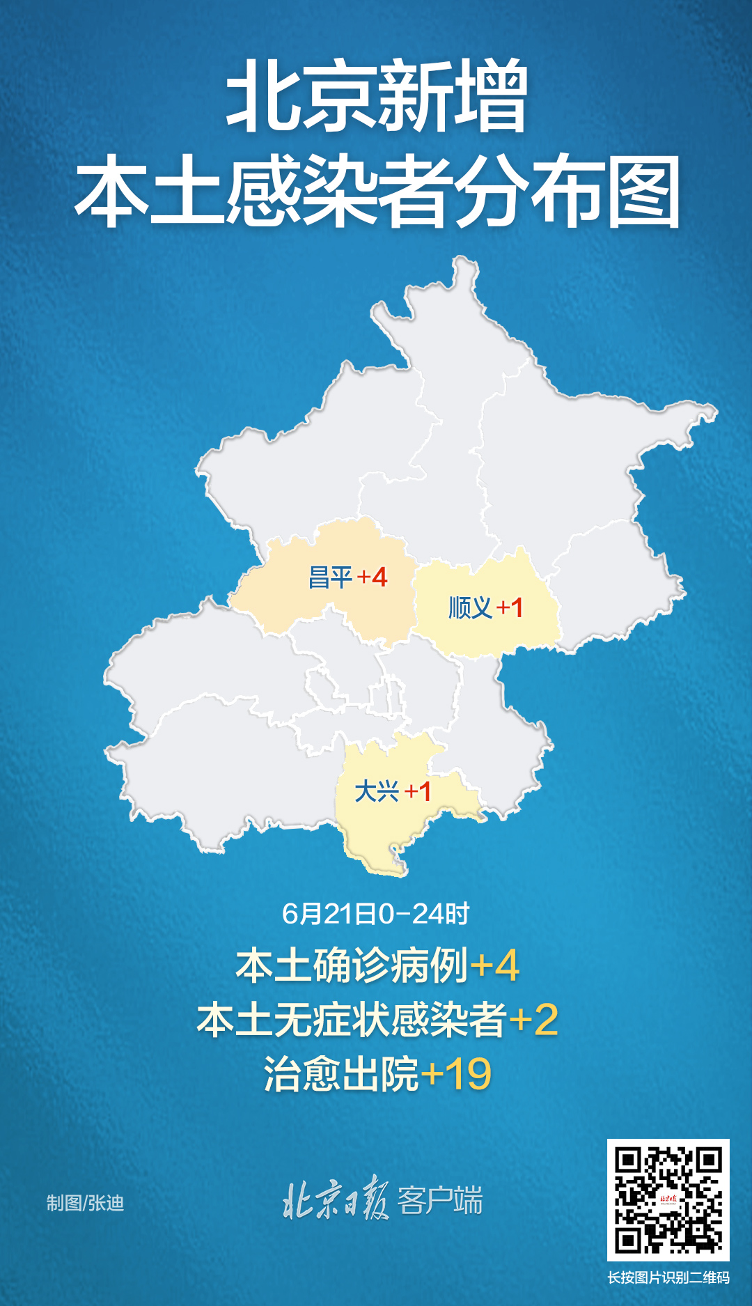 6月21日0时至24时,北京新增4例本土确诊病例和2例无症状感染者,无新增疑似病例;新增1例境外输入确诊病例和1例无症状感染者,无新增疑似病例。治愈出院19例。