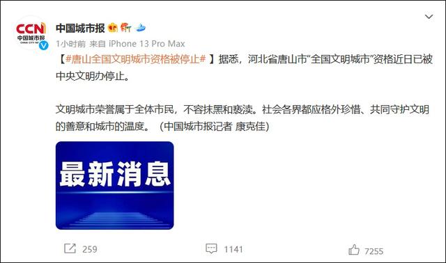 “河北省唐山市‘全国文明城市’资格近日已被中央文明办停止。文明城市荣誉属于全体市民,不容抹黑和亵渎。社会各界都应格外珍惜、共同守护文明的善意和城市的温度”。今天上午,中国城市报这则报道引发广泛关注。