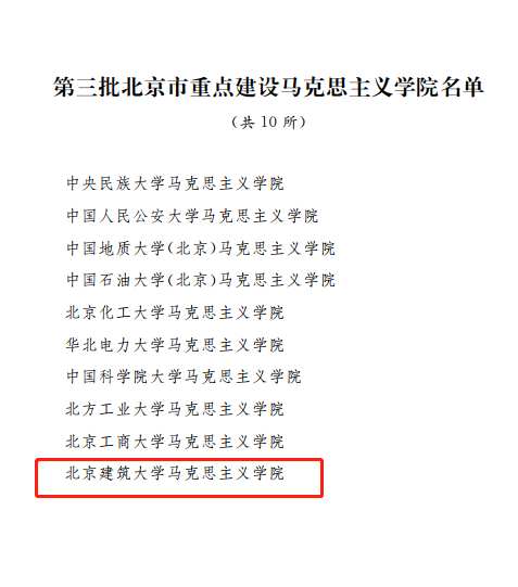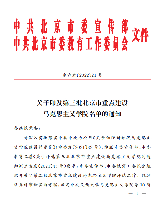 日前,中共北京市委宣传部、中共北京市委教育工委联合下发《关于印发第三批北京市重点建设马克思主义学院名单的通知》(京宣发〔2022〕21号),我校马克思主义学院与中央民族大学马克思主义学院等共10所马克思主义学院,被确定为第三批北京市重点建设马克思主义学院。这是学校持续提升马克思主义学院建设的重大成果,也是学校不断加强党建和思想政治工作实效的重要体现。