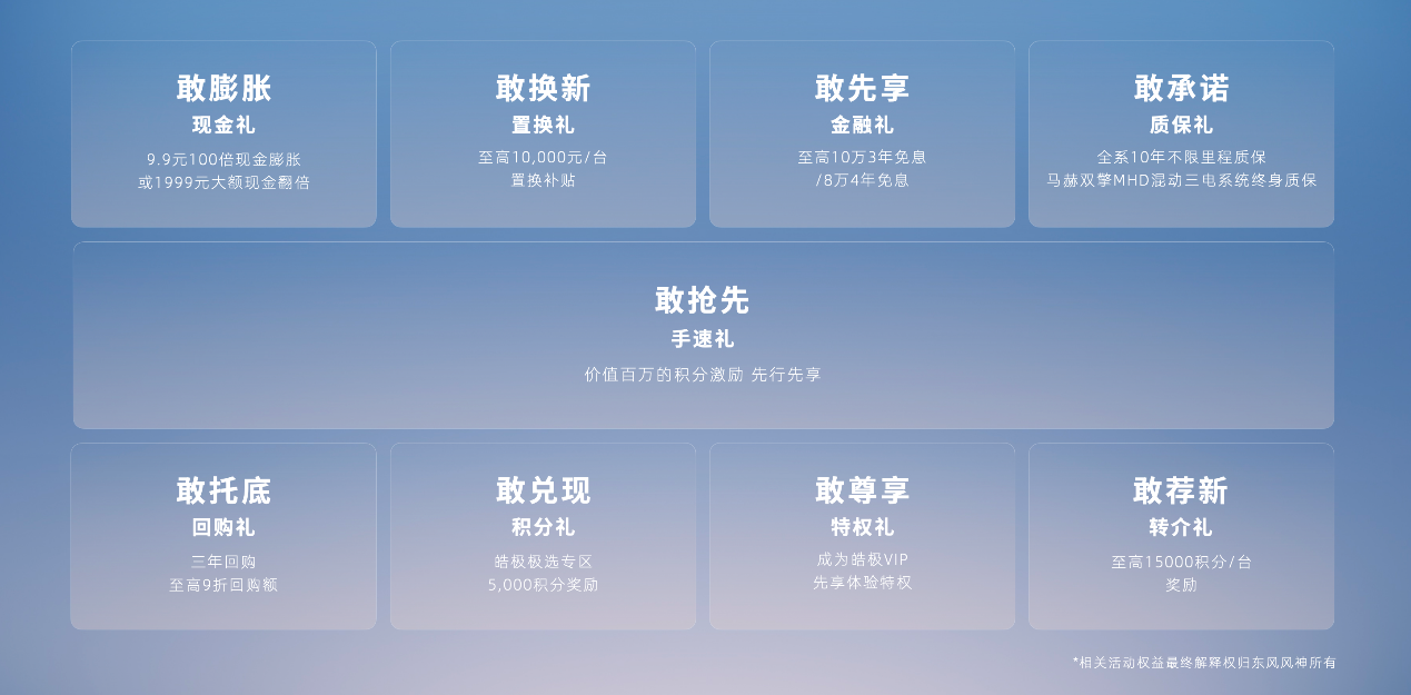 此外,东风风神还为皓极提供了包括“至高10万3年免息贷款,或8万4年免息贷款”等在内的9大预售权益,进一步降低了用户的购车门槛,这也成为了皓极预售即获热捧的另一个重要原因。