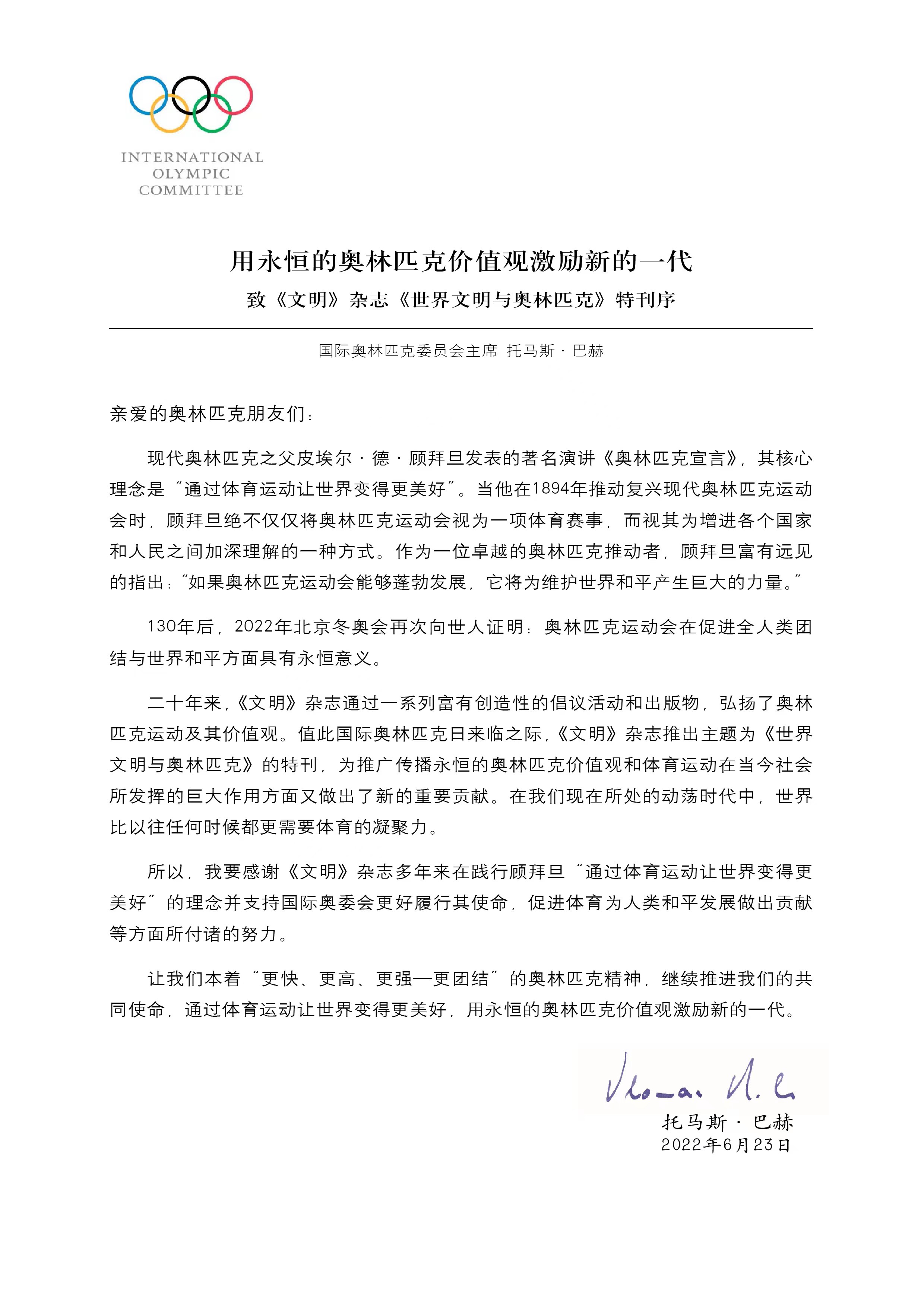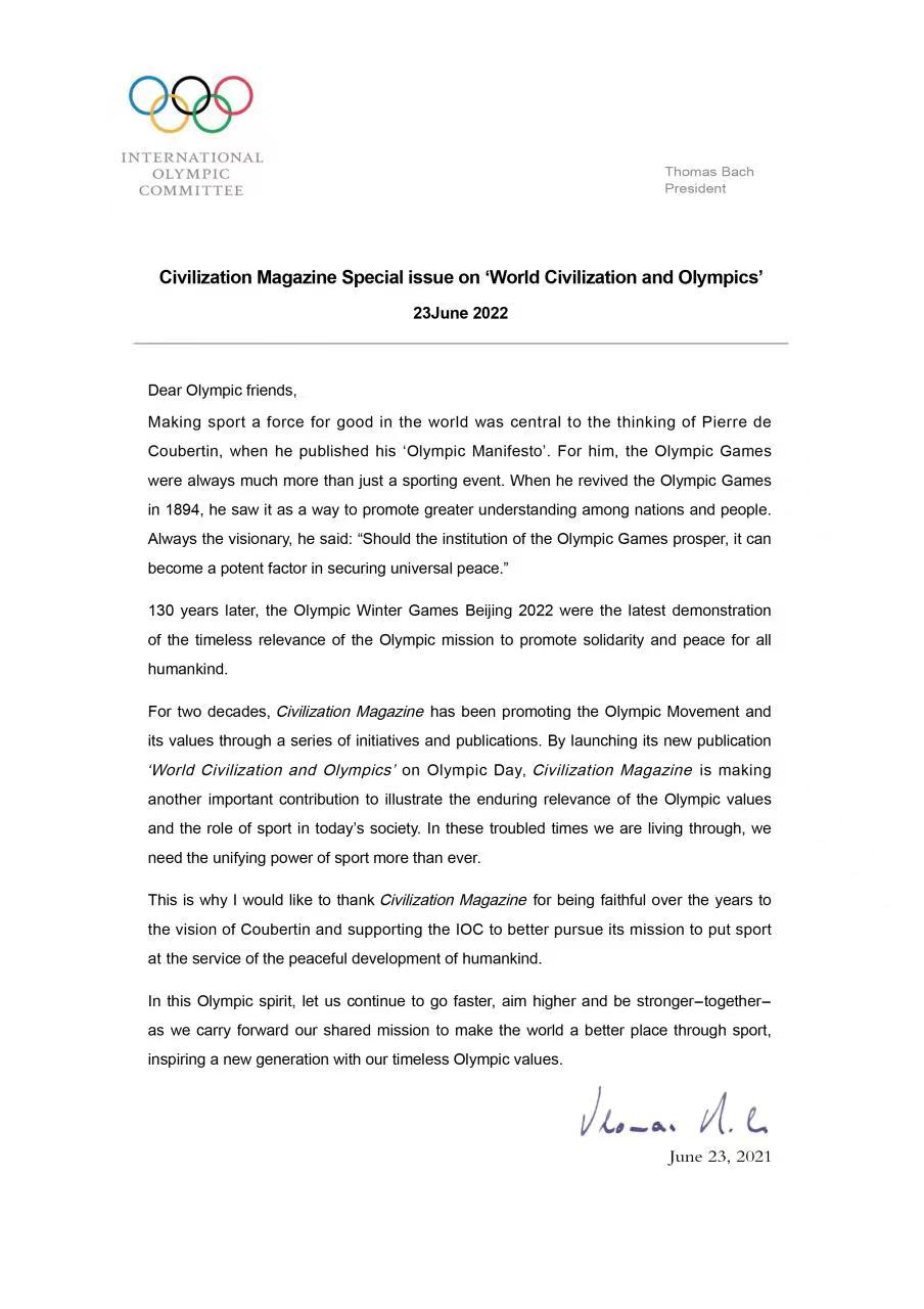 2022年6月23日,国际奥委会主席巴赫给即将推出《世界文明与奥林匹克》特刊的《文明》杂志发来序言,其中动情地写道:让我们本着“更快、更高、更强、更团结”的奥林匹克精神,继续推进我们的共同使命,通过体育运动让世界变得更美好,用永恒的奥林匹克价值观激励新的一代。
