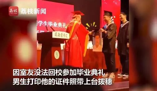 位于安徽芜湖的皖南医学院,一位男生因室友无法回校参加毕业典礼,特地打印了室友的证件照,带“他”上台拨穗,甚至还贴心地为“他”戴了一顶学士帽,弥补了室友不能前来的遗憾。对此,校领导和老师报以掌声和笑声。