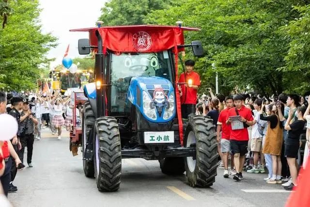 挂满霓虹彩灯的拖拉机、“盛装出行”的联合收割机、遛狗出街的毕业生队列,还有6匹高头大马……你没看错,这是华中农业大学毕业典礼的一部分。典礼一反庄重、严肃、秩序感氛围,将巡游展示纳入其中,学校领导还在机车上与师生热情互动。
