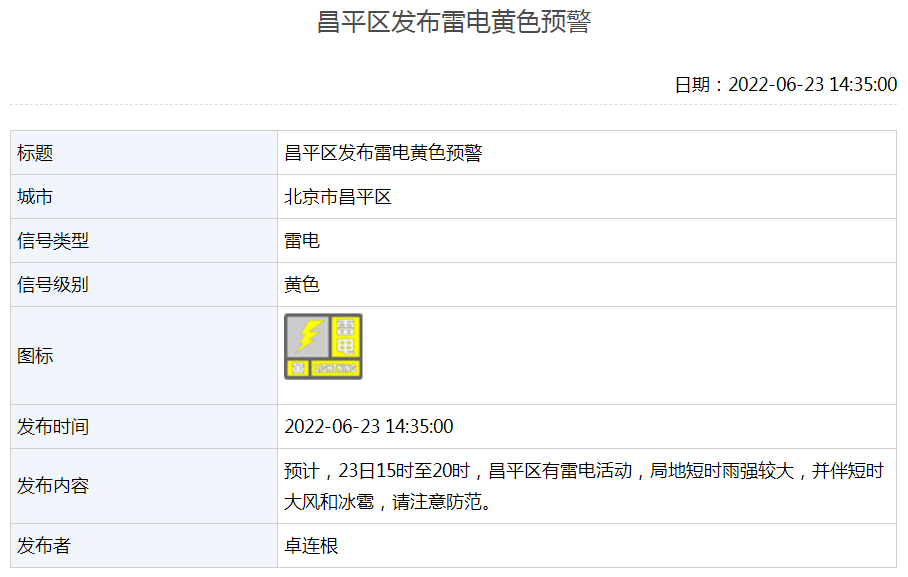 昌平区发布雷电黄色预警:预计,23日15时至20时,昌平区有雷电活动,局地短时雨强较大,并伴短时大风和冰雹,请注意防范。