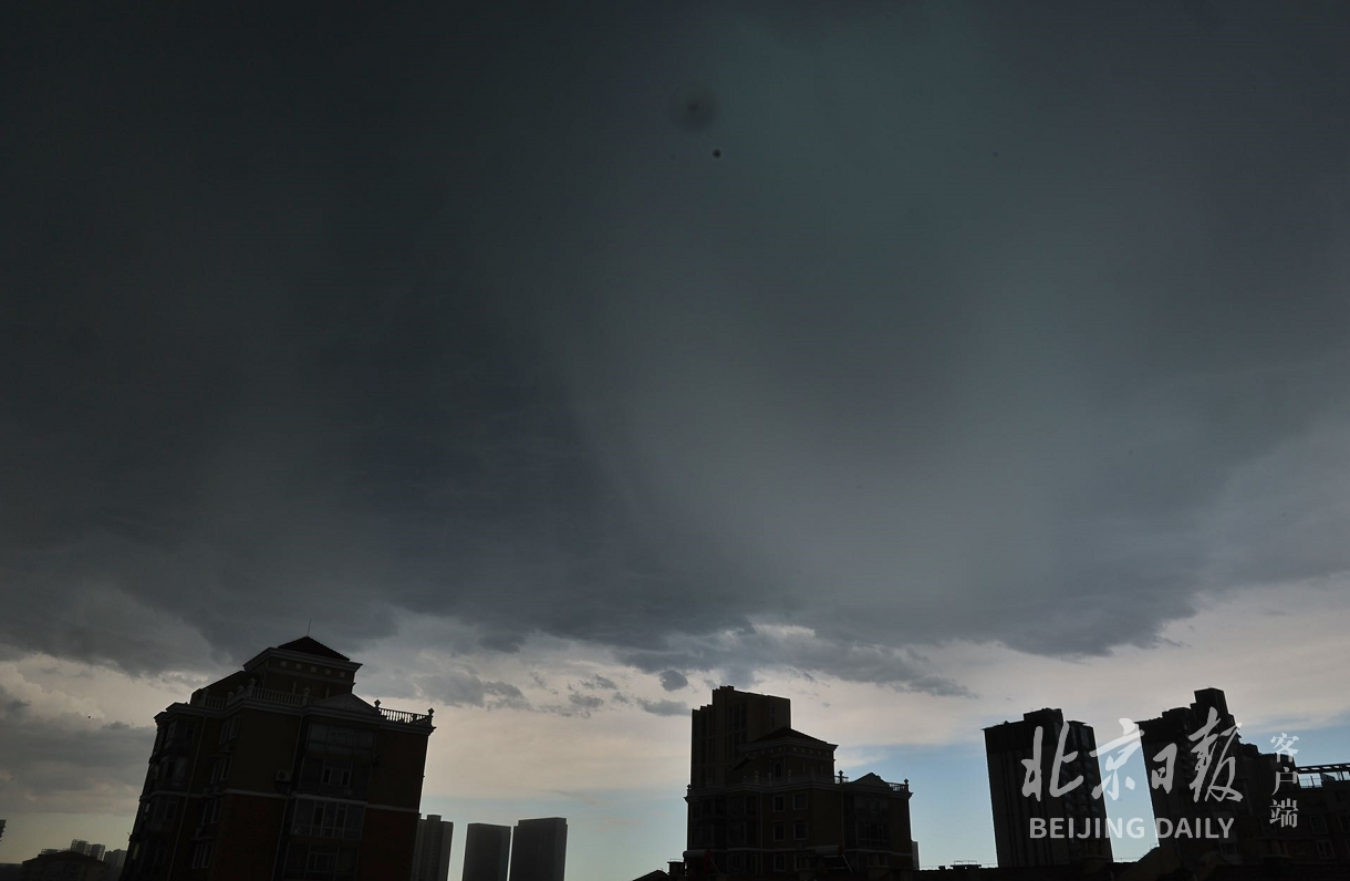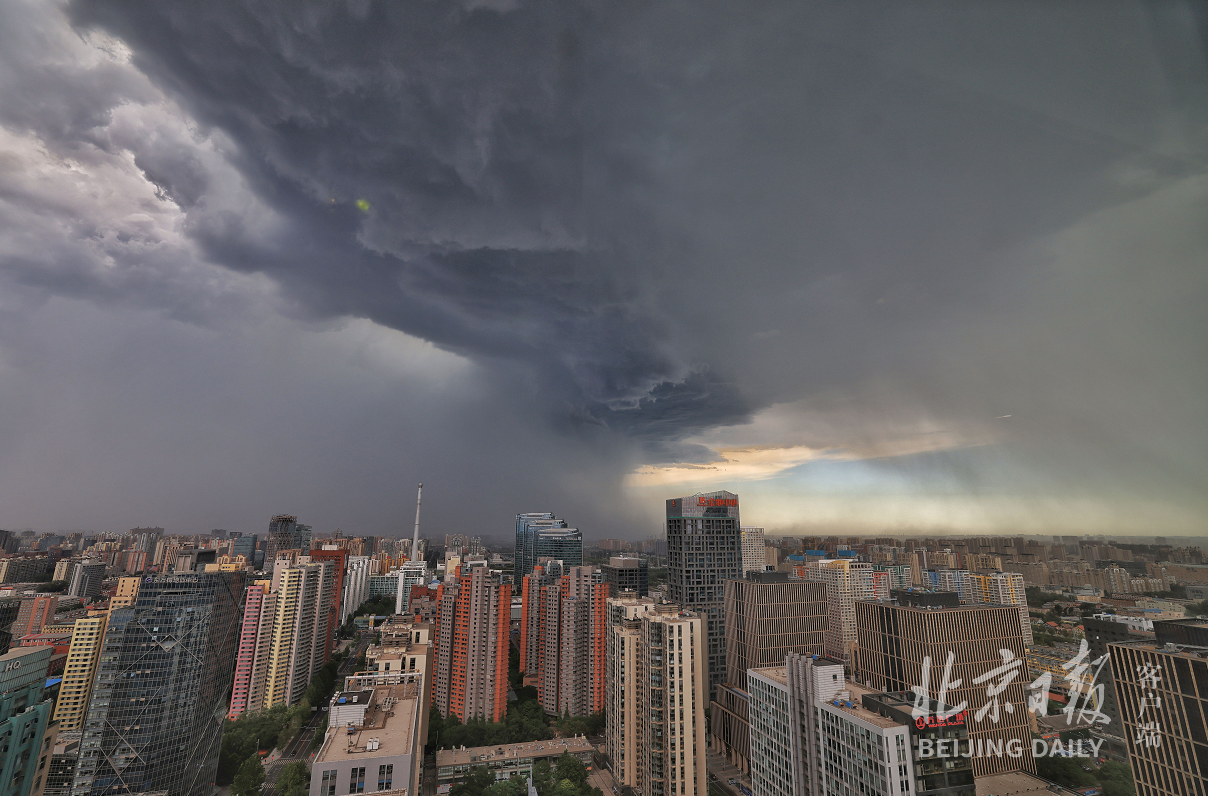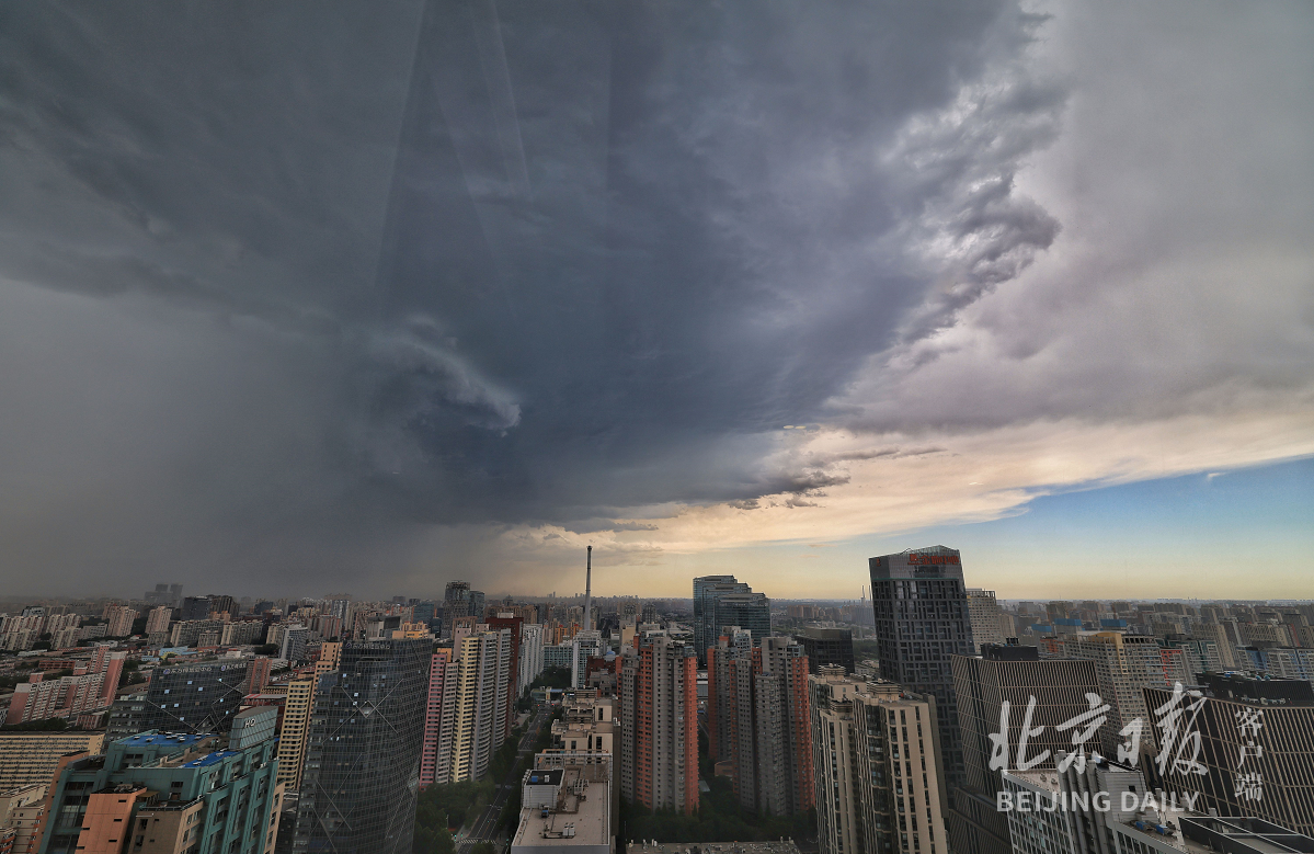 6月23日下午4时左右,北京天气由晴好转阴,从CBD东侧远望,乌云滚滚而来,天空一半明媚,一半阴云密布。