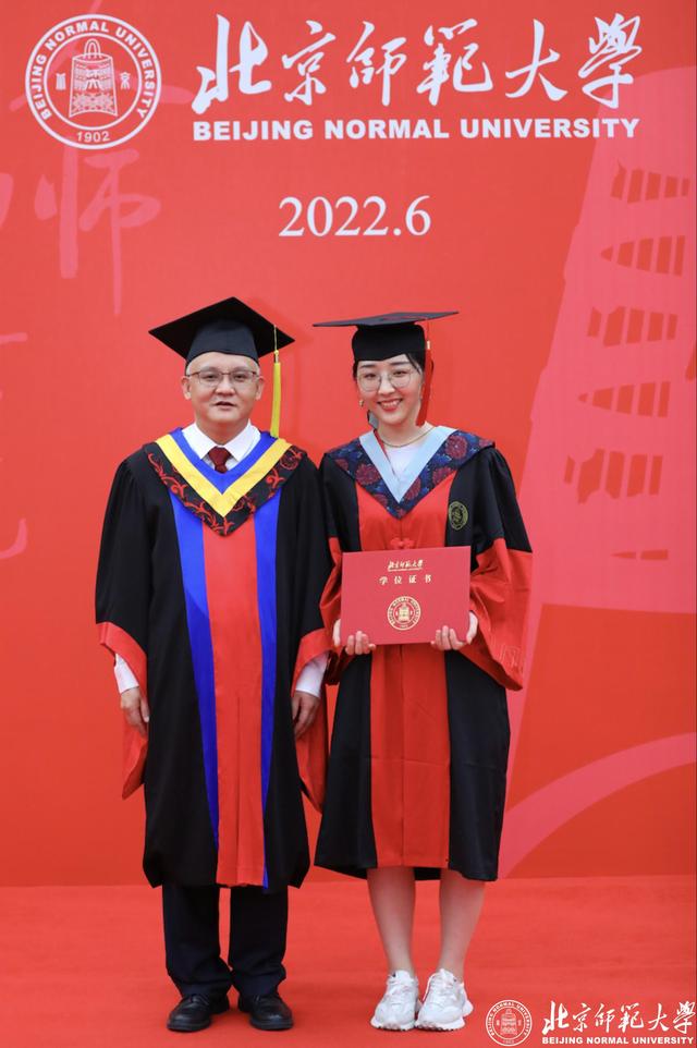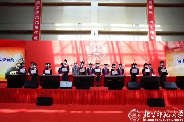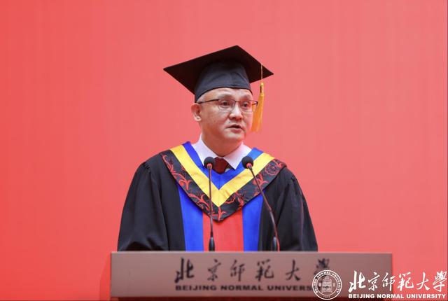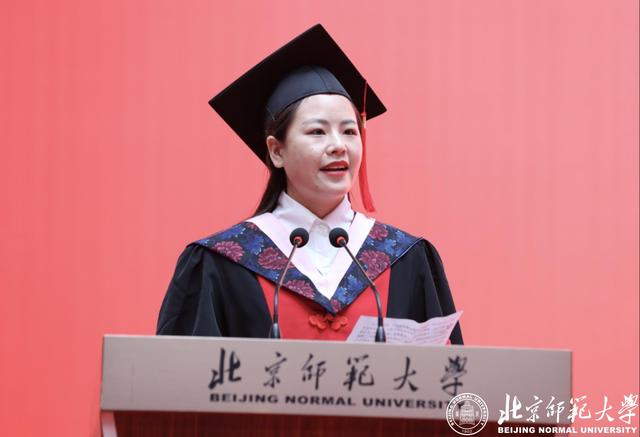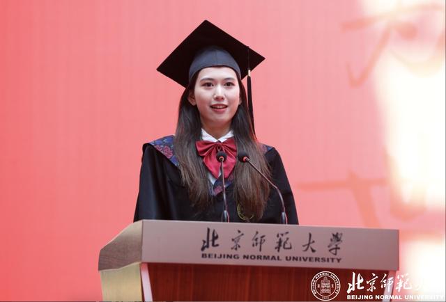 本科生毕业生代表、地理科学学部公费师范生田雨欣纯以《扬帆师大传薪火,落笔千山绘中华》为题发言。她分享了自己在北师大收获的成长和蜕变,感恩学校提供的学习资源、实践机会和育人环境,表达了要做知识传授者、爱的传递者和教育兴邦的践行者,立志成为一名“四有”好老师的坚定信念。研究生毕业生代表、经济与资源管理研究院博士研究生张欣欣以《把论文写在祖国大地上》为题发言。她讲述了自己在北师大红色基因的感召下,用科研和调研成果服务脱贫攻坚的经历,表达了要把论文写在祖国大地上的坚定志向,她号召所有毕业生传承治学修身、兼济天下的红色师范精神,怀揣梦想、勇敢前行。
