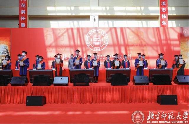 毕业典礼在雄壮的国歌声中拉开帷幕。毕业典礼上,涂清云宣读了《北京师范大学关于授予学士、硕士和博士学位的决议》,2022年我校共授予625人博士学位,授予4012人硕士学位,授予3395人学士学位。工作人员宣读了《北京师范大学关于表彰入选“四有”好老师启航计划毕业生的决定》《北京师范大学关于表彰到西部和基层就业毕业生的决定》以及《北京师范大学关于表彰2022届北京市和校级优秀毕业生的决定》。在主会场出席典礼的学校领导、学位评定委员会委员和校友向受表彰毕业生代表颁发荣誉证书。