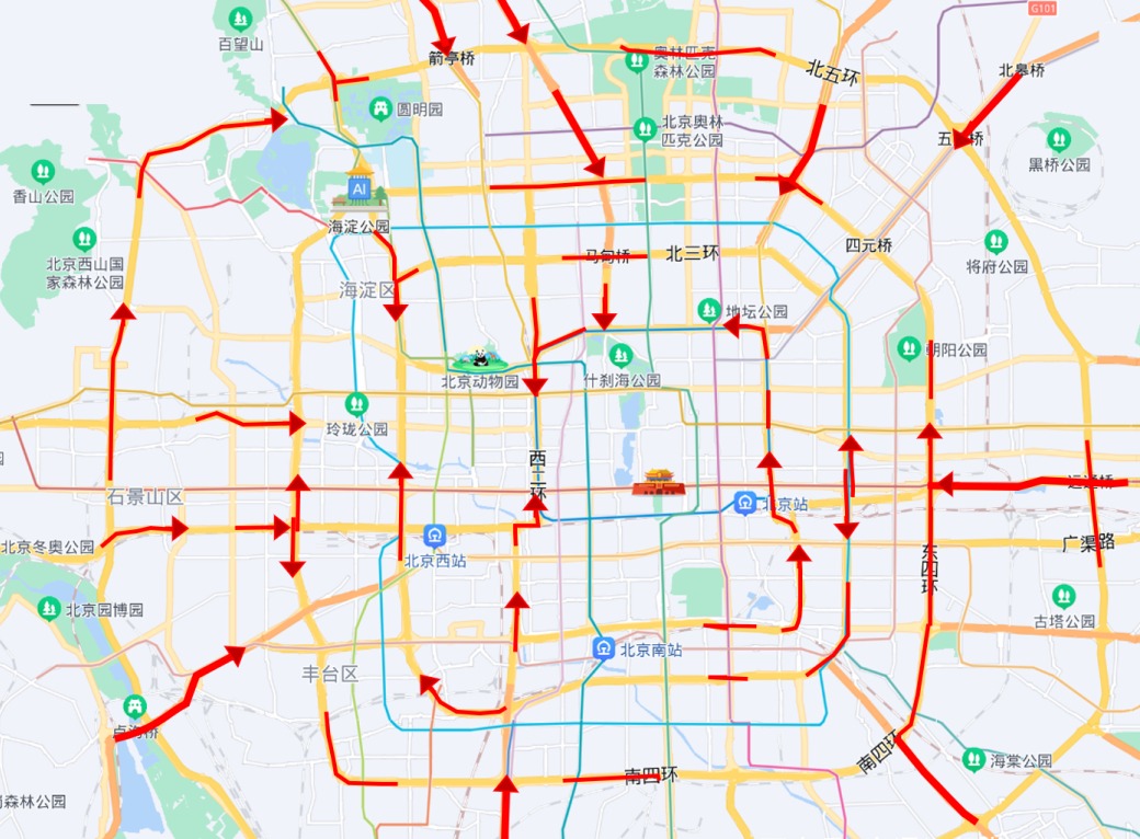 受降雨天气路面湿滑影响,道路通行效率下降,易发生追尾剐蹭等交通事故。周一中小学返校,交通出行量明显增加,通勤、通学高峰叠加, 7:30-8:30之间交通压力大,局部地区交通指数峰值或将达到 8.2左右,处 严重拥堵级别。东部、北部、西部区域二、三、四环,以及京藏、京承、京港澳、京开、机场高速、京通快速等主要高速公路进城方向,莲石路、阜石路、万泉河路、西直门北大街等主要联络线进城方向部分路段交通压力集中,短时将达严重拥堵级别。