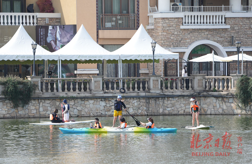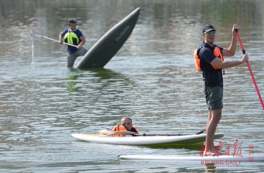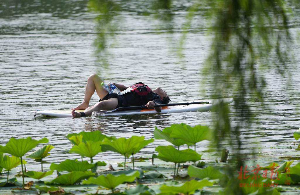 今天京城气温高达39摄氏度,在北京朝阳公园湖面上,喜欢水上运动的人们身穿救生衣,挥动桨柄,感受着水上皮划艇及桨板带来的放松和快乐。