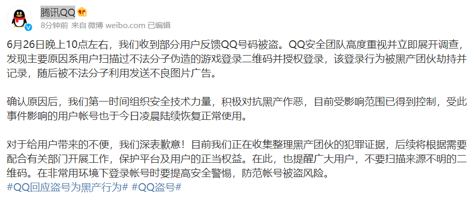 6月27日,腾讯QQ官方微博回应“大量账号被盗”事件: