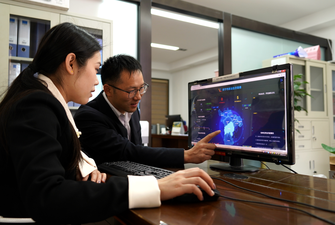 云南省安宁市纪委监委以大数据技术为支撑,探索建立政治生态评估预警系统,以科技引航、即时预警、实时研判,推动对“关键少数”的监督更智能。图为该市纪检监察干部查看系统发出的预警信息。(云南省安宁市纪委监委 聂涵 摄)