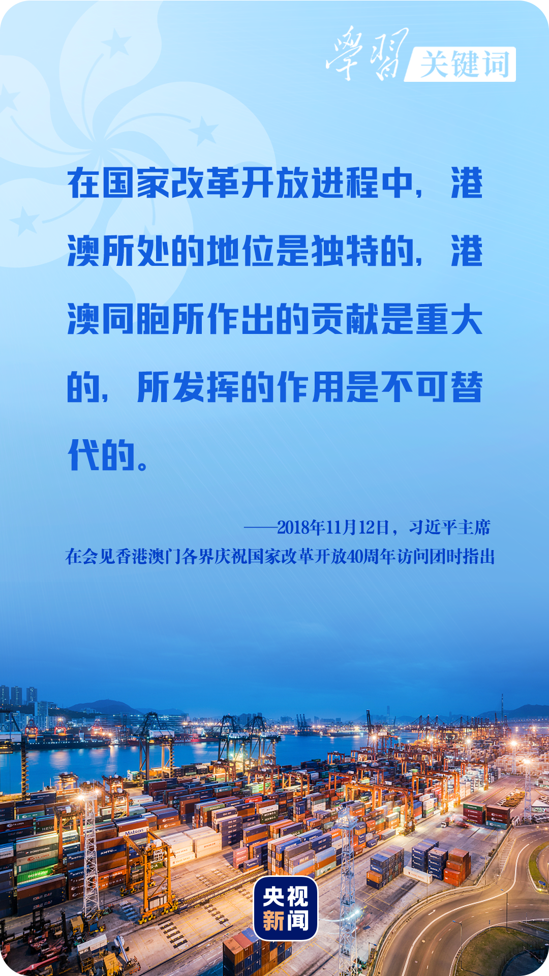 “香港背靠祖国、面向世界,有着许多有利发展条件和独特竞争优势。特别是这些年国家的持续快速发展为香港发展提供了难得机遇、不竭动力、广阔空间。”2017年7月1日,习近平主席在庆祝香港回归祖国二十周年大会暨香港特别行政区第五届政府就职典礼上坚定地说。