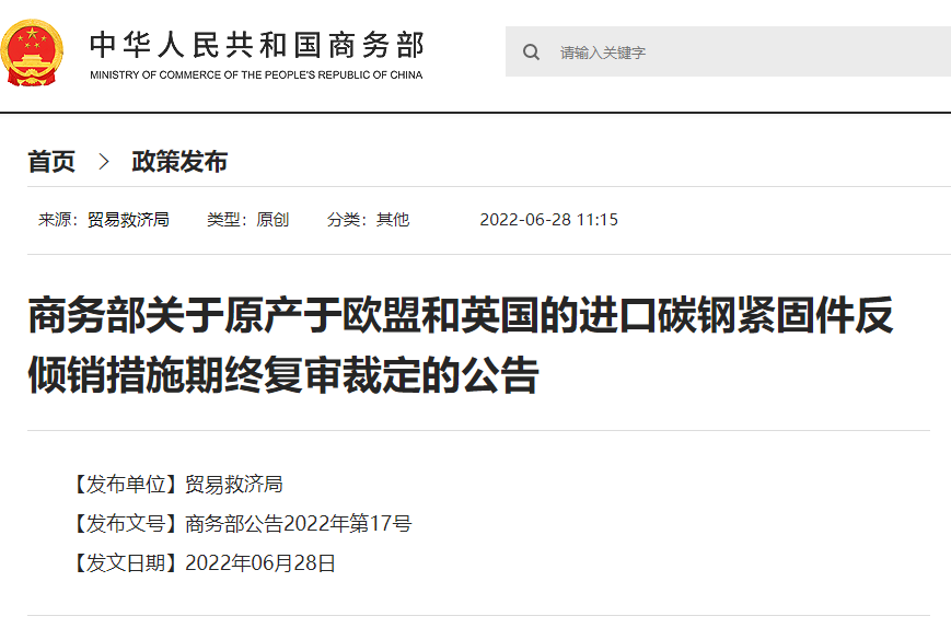 2021年6月28日,应中国碳钢紧固件产业申请,商务部发布2021年第14号公告,决定自2021年6月29日起,对原产于欧盟和英国的进口碳钢紧固件所适用的反倾销措施进行期终复审调查。