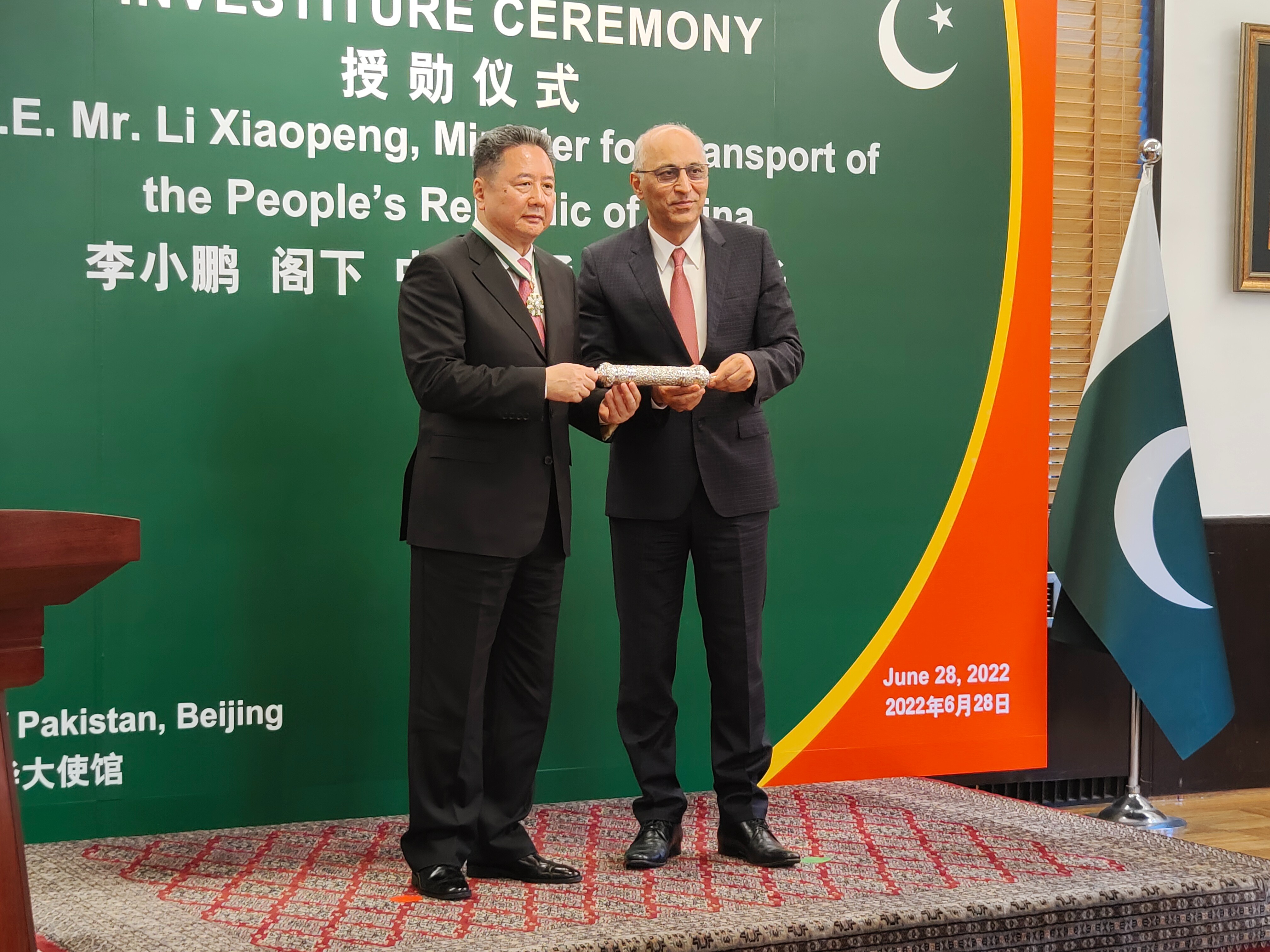 6月28日,巴基斯坦驻华大使莫因·哈克代表巴基斯坦总统阿尔维授予中国交通运输部部长李小鹏“巴基斯坦卓越新月勋章”。
