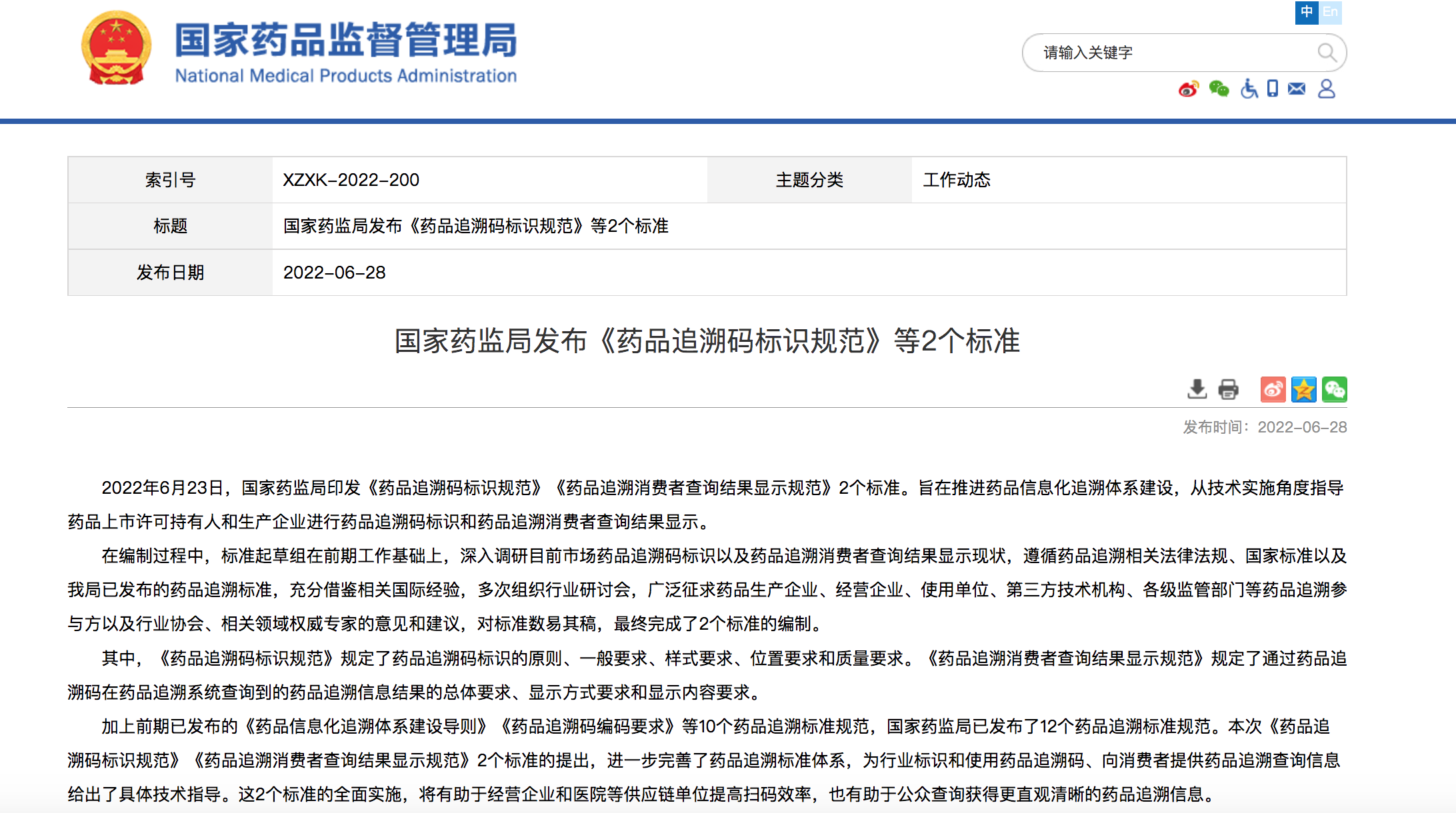 6月28日,国家药监局官网显示,《药品追溯码标识规范》《药品追溯消费者查询结果显示规范》2个标准已于6月23日印发。旨在推进药品信息化追溯体系建设,从技术实施角度指导药品上市许可持有人和生产企业进行药品追溯码标识和药品追溯消费者查询结果显示。