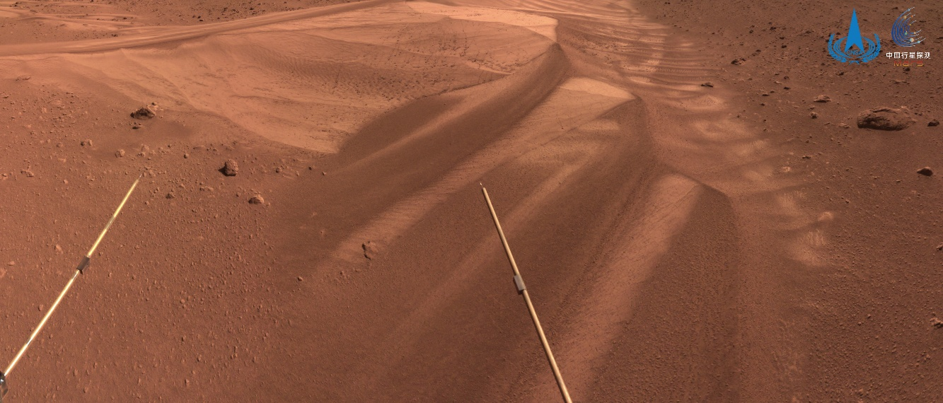 “祝融号”拍摄巡视区影像,图像为火星车进入冬季休眠状态前拍摄,展示了巡视区域一处沙丘地貌的局部特征。