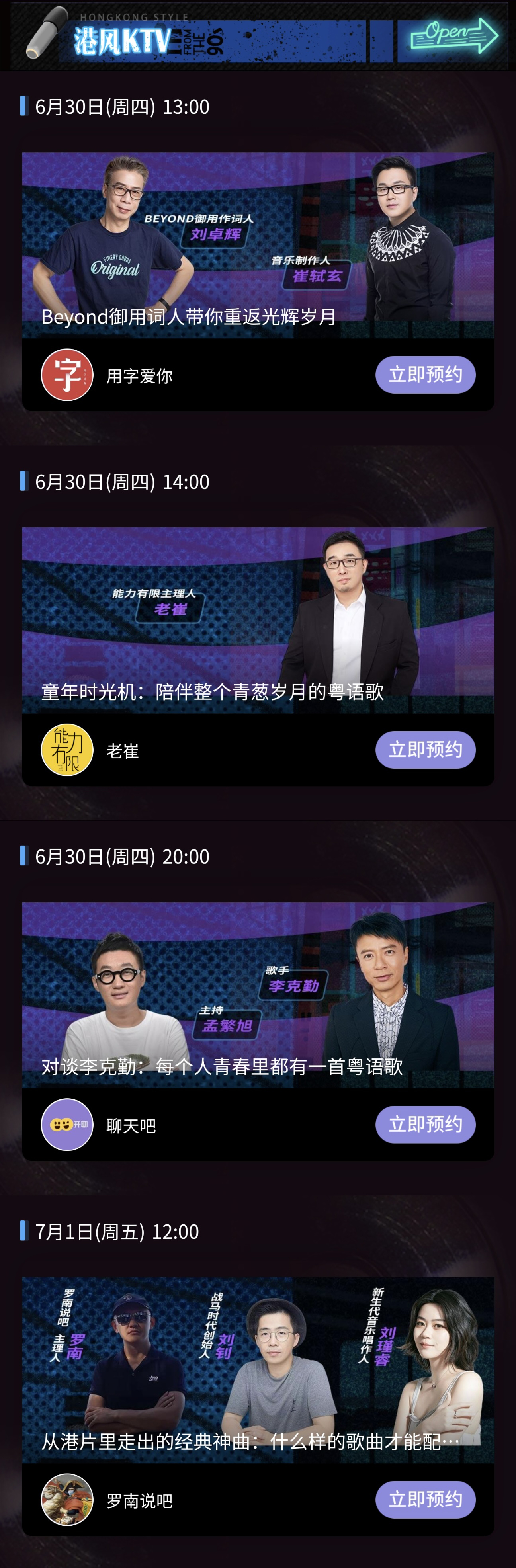 6月30日围绕香港音乐话题有4场直播。其中,作词人刘卓辉和崔轼玄将带来主题为《Beyond御用词人带你重返光辉岁月》的直播,刘卓辉曾为张学友、Beyond、黎明等歌手创作大量优秀歌曲,被称为“Beyond御用作词人”,崔轼玄则创作过《爱如空气》《红颜劫》《可念不可说》等知名作品。