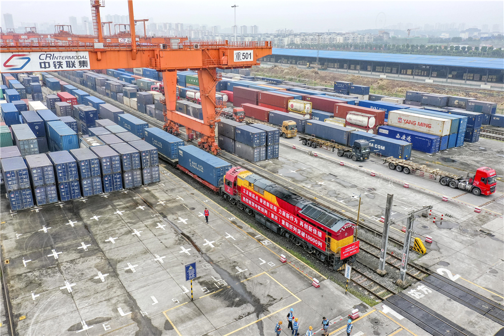 中欧班列(重庆)第10000列列车在重庆团结村中心站等待发车(2022年6月23日摄,无人机照片)。新华社记者 黄伟 摄