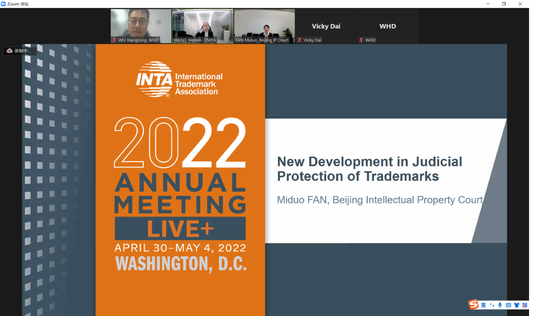 ▲ 知产法官在INTA2022年年会“CTA论坛”发表英文主旨演讲