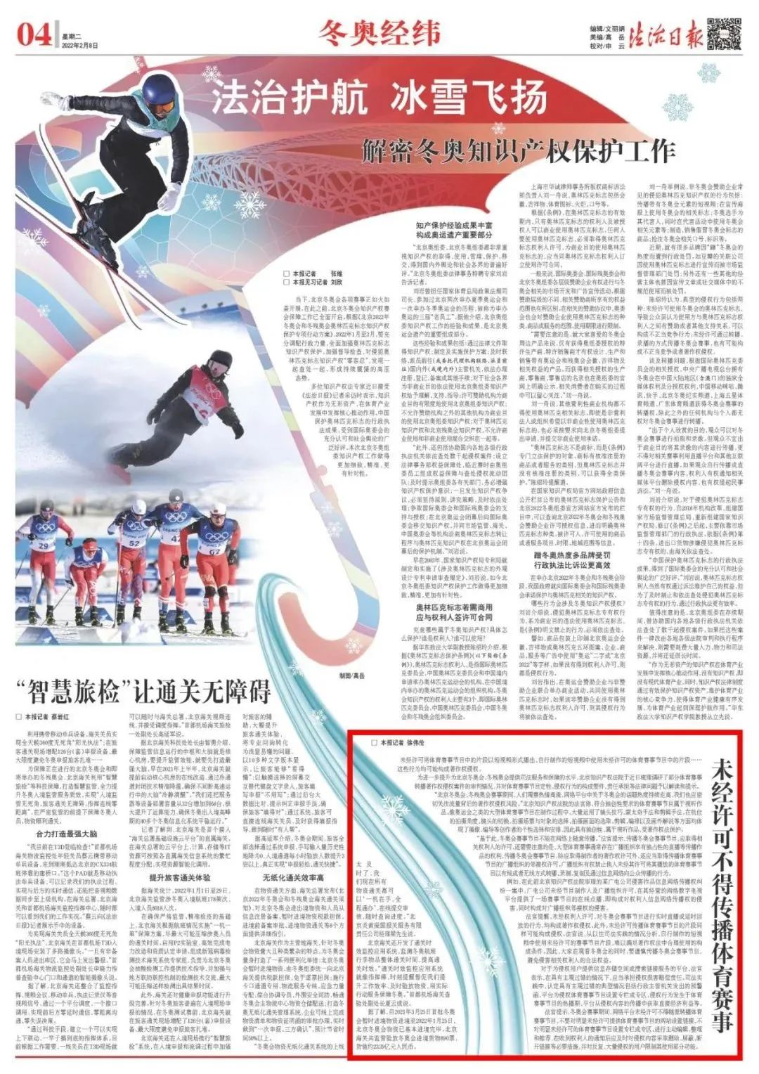 北京冬奥会、冬残奥会开幕前夕,北京知识产权法院梳理调研部分体育赛事转播著作权侵权案件的审判情况,解读并提示体育赛事节目定性、侵权行为的构成要件、责任承担等法律问题。光明日报、法治日报、北京日报、北京青年报等多家新闻媒体对此进行了报道。