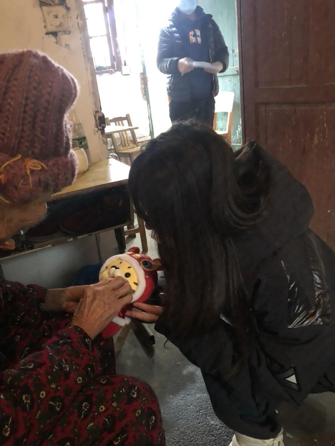 2021年12月,新春慰问行志愿者前往华容看望雷金二老人,雷奶奶开心地抚摸着志愿者带给奶奶小老虎玩偶。图源 | 新春慰问行团队