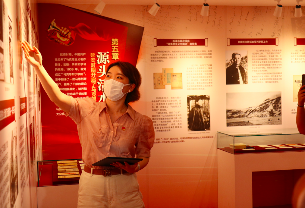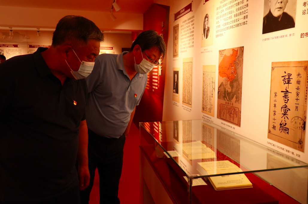 正式开放运营前一天下午,这里迎来了首批前来探访的客人。展览路街道工委书记张宝生和十几位基层党员走进位于二层的展厅参观。展板上是党史各个时期的大事件,展柜里陈列着党史书籍、各类报刊原件、复印件等。