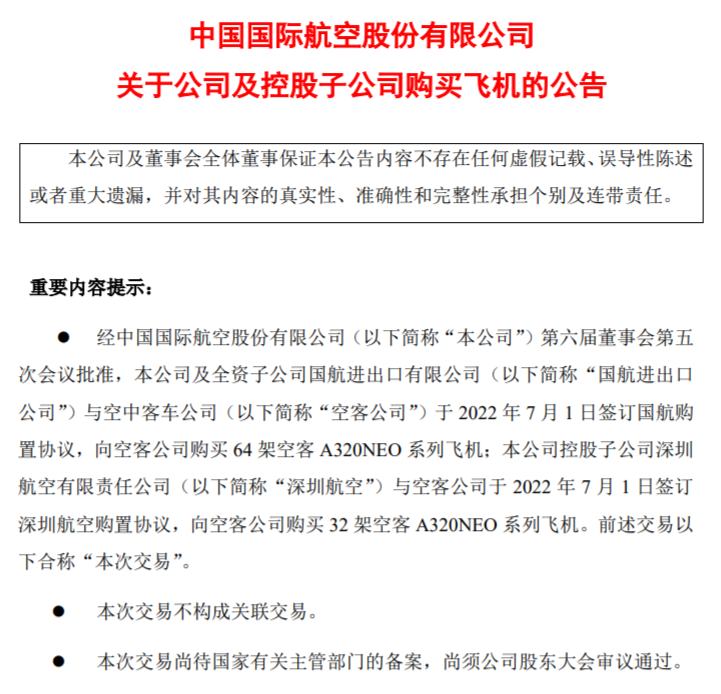 中国国航公告:7月1日与空客公司签订协议,公司及全资子公司国航进出口公司向空客公司购买64架空客A320NEO系列飞机;控股子公司深圳航空购买32架空客A320NEO系列飞机。前述96架空客A320NEO飞机的基本价格合计约为122.13亿美元。在本次交易中,国航拟购买的前述飞机计划于2023至2027年分批交付;深圳航空拟购买的前述飞机计划于2024至2026年分批交付。