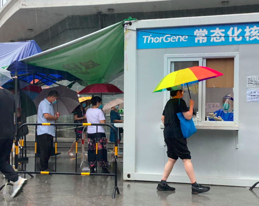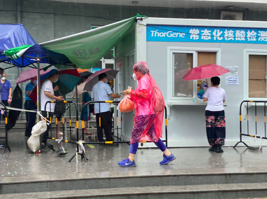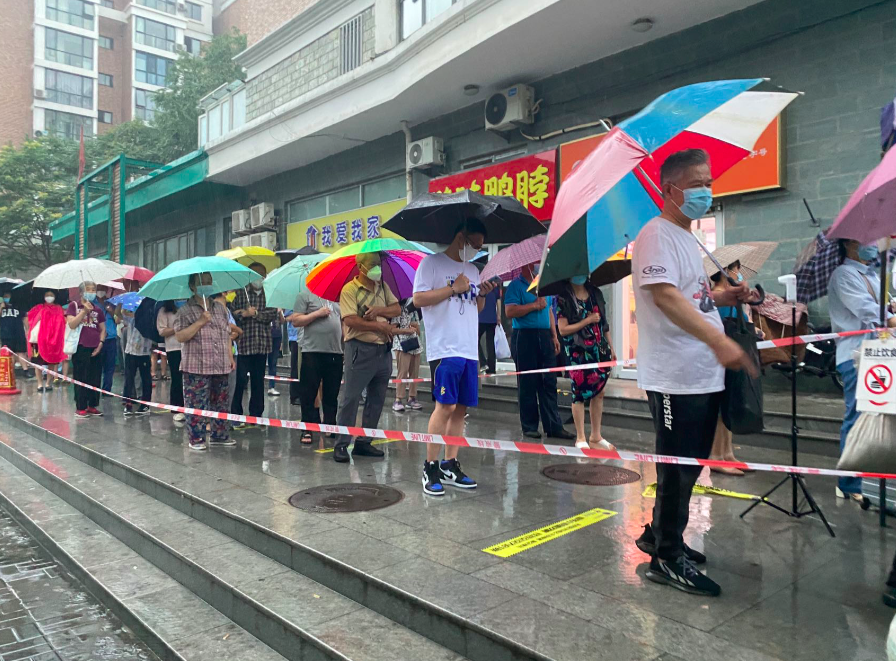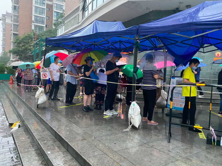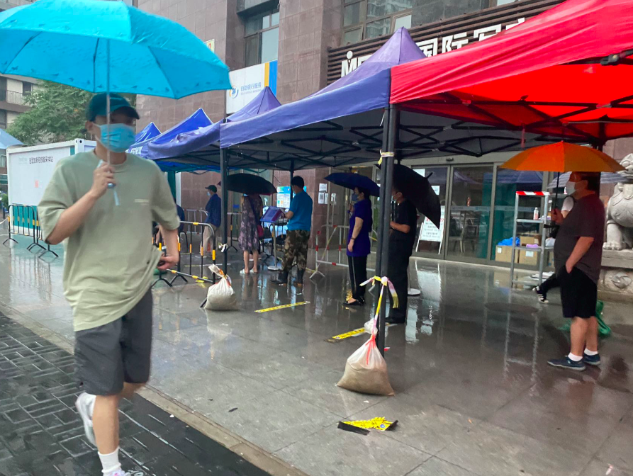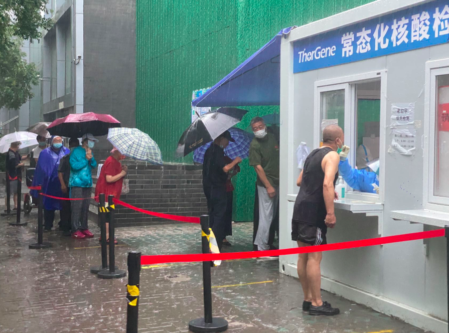 7月3日上午,北京突降倾盆大雨,在东花市街道的数个常规核酸检测点前,居民排起长队并井然有序。为了不耽误明天的正常出行,大家冒雨进行核酸检测。同时为减少居民等待时间,一些检测点也紧急加派检测人员、增加检测窗口并进行及时疏导。