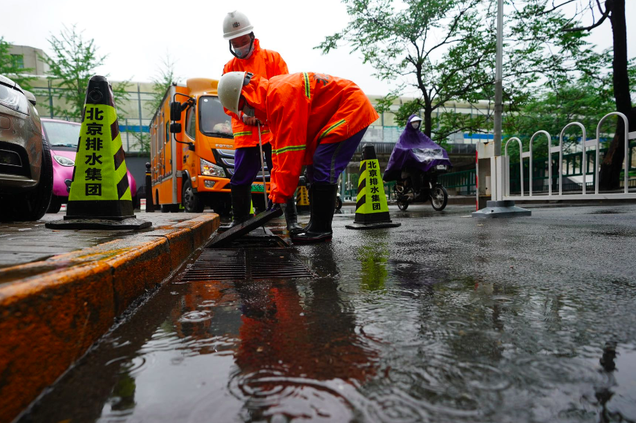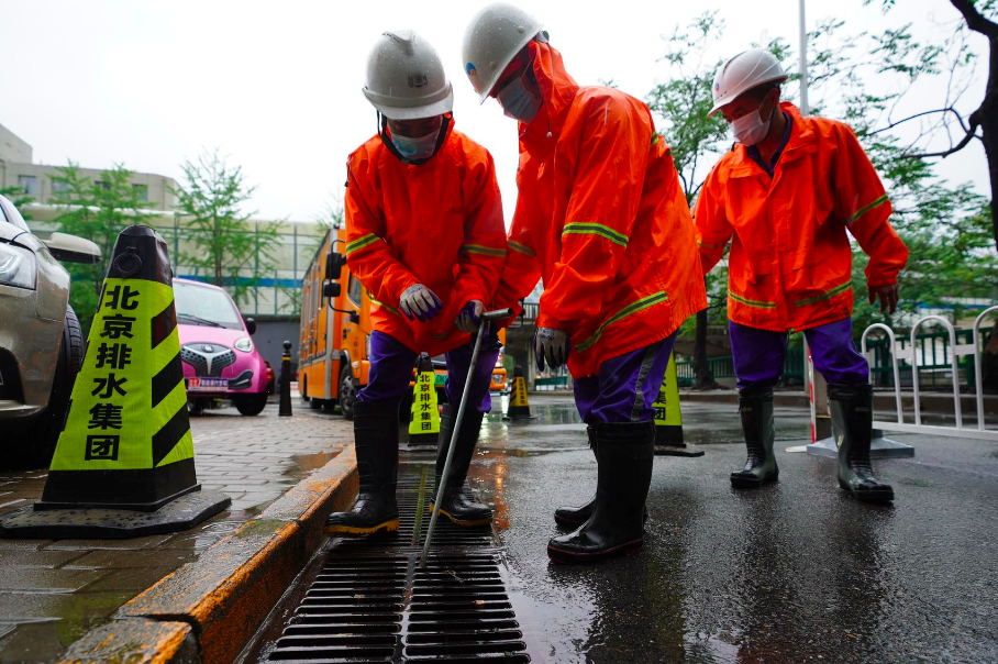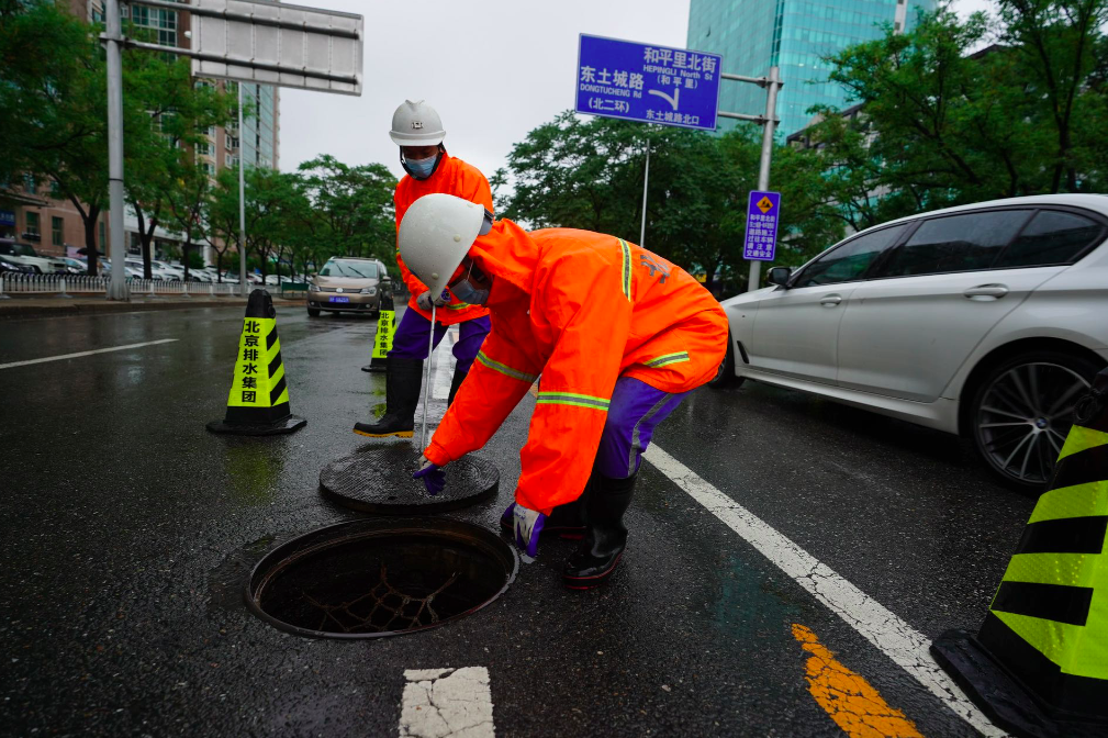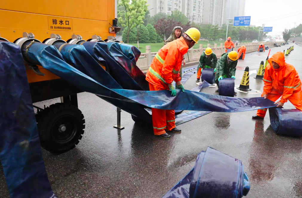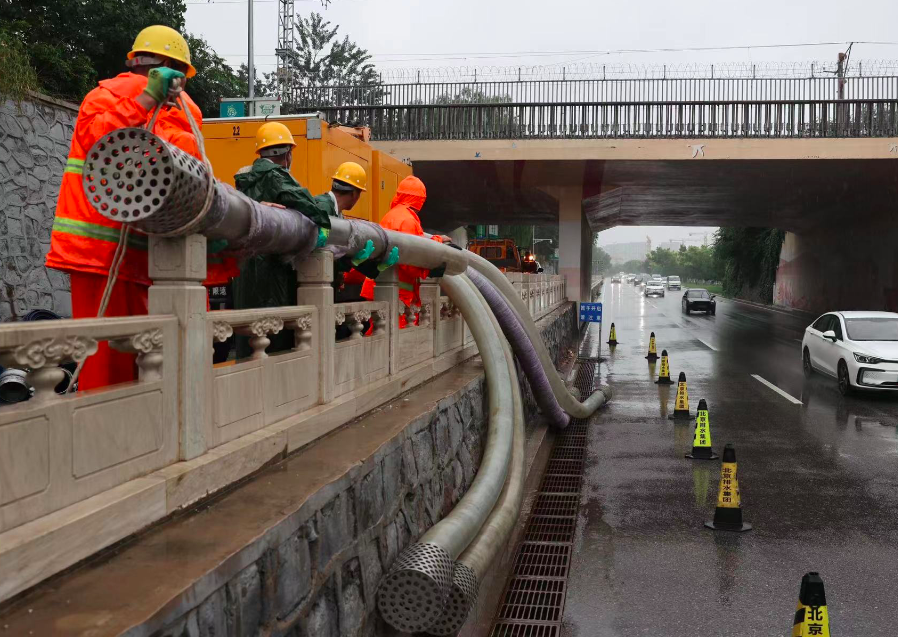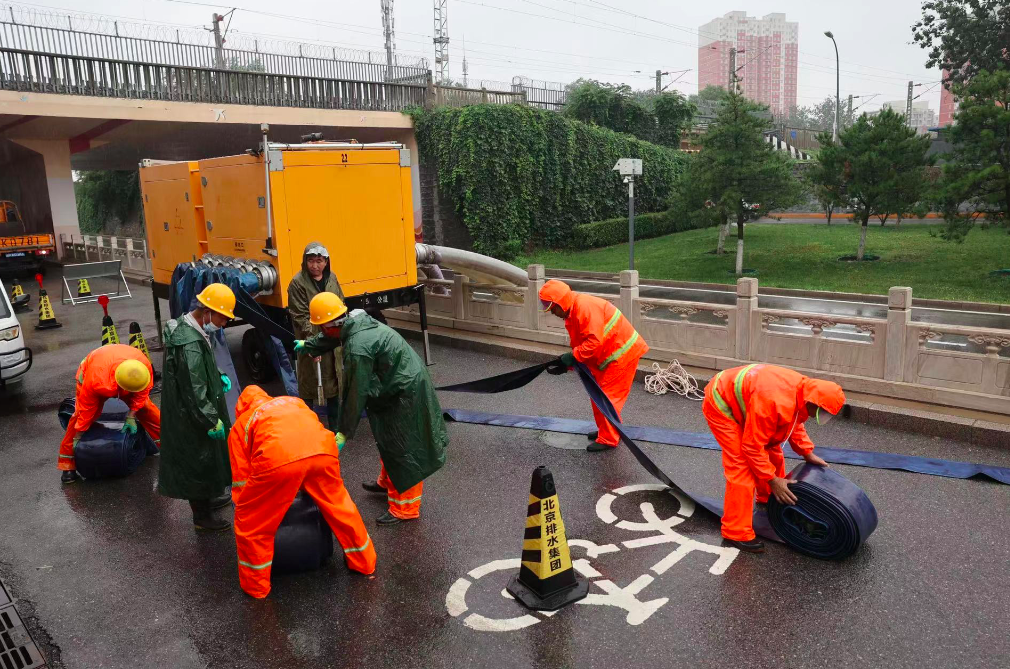 北京市城市排水集团有限公司坝河流域分公司生产设施中心运行四班工作人员早上六点多到达金泰桥下凹桥区,该点位地势低凹且没有泵站,雨量大时容易早上积水,影响交通。为此市排水集团安排专班在此值守,确保桥区汛期安全。