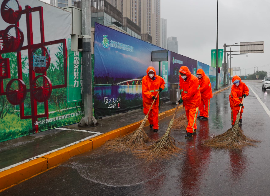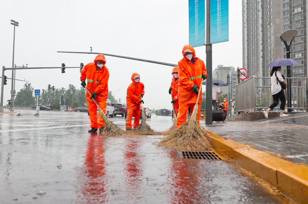 北京环卫集团通州京环公司工作人员在北运河西地铁站周边的城市道路清掏箅子及进行推水作业,以方便市民进出地铁站。