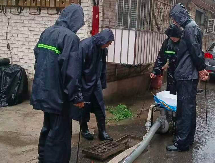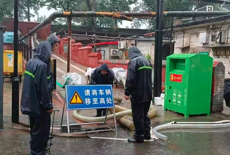 石景山区古城街道抢险队、安全生产检查队在防汛重点点位水泥厂社区现场巡查值守。现场准备6寸汽油泵2台,4寸汽油泵1台,3寸汽油泵1台,高扬程潜水泵2台,根据雨情变化结合水位情况随时准备抢险排水。