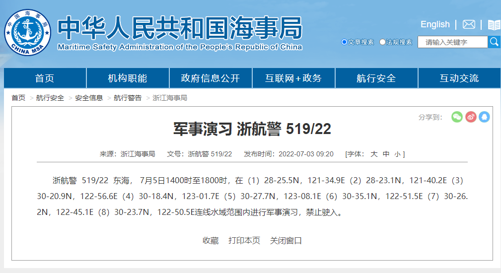 据中华人民共和国海事局网站消息,浙江海事局发布航行警告,浙航警 519/22 东海, 7月5日14时至18时,在(1)28-25.5N,121-34.9E(2)28-23.1N,121-40.2E(3)30-20.9N,122-56.6E(4)30-18.4N,123-01.7E(5)30-27.7N,123-08.1E(6)30-35.1N,122-51.5E(7)30-26.2N,122-45.1E(8)30-23.7N,122-50.5E连线水域范围内进行军事演习,禁止驶入。