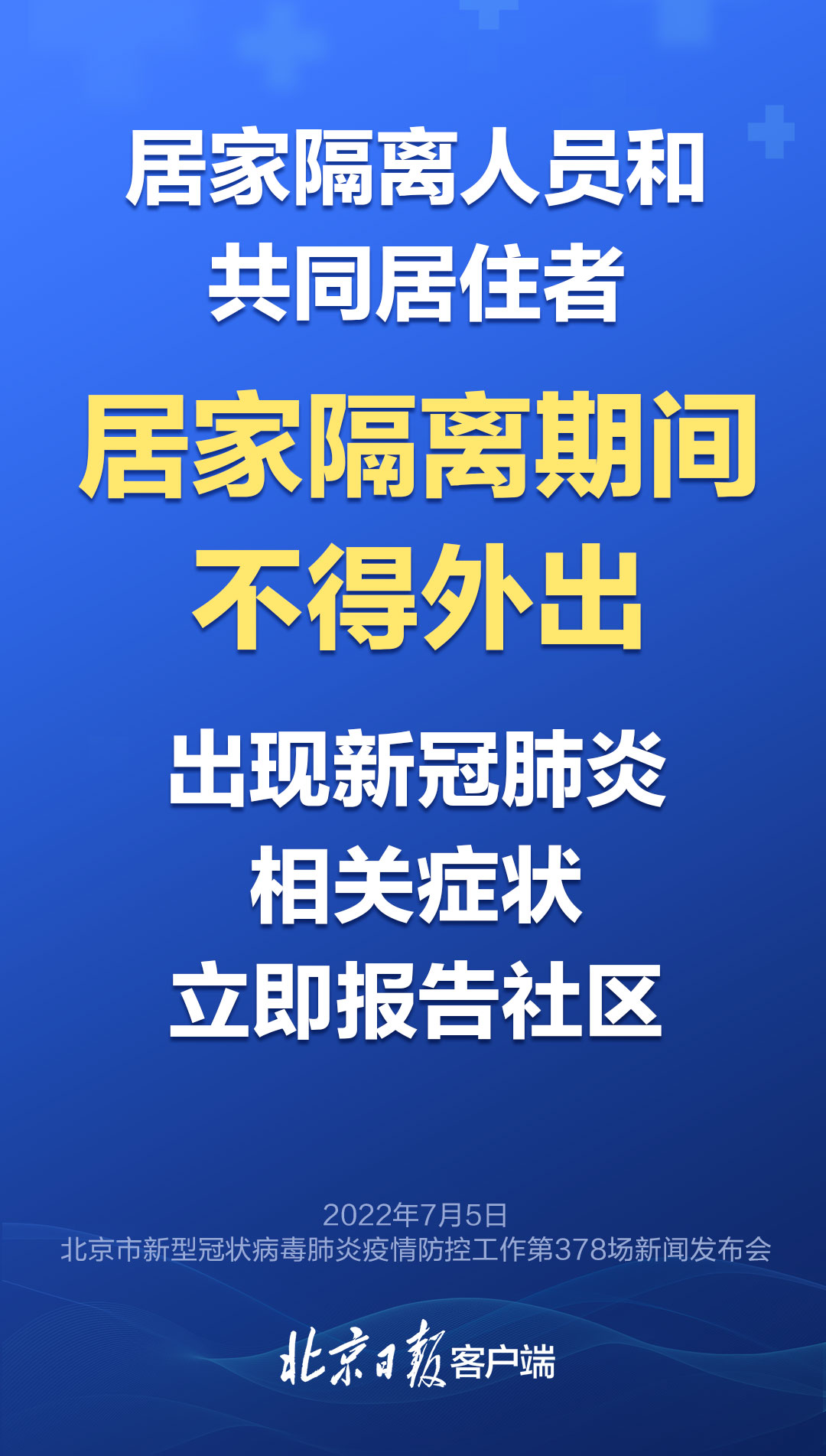 7月5日,在北京市新型冠状病毒肺炎疫情防控工作第378场新闻发布会上,市疾控中心副主任刘晓峰提醒:居家隔离人员和共同居住者在居家隔离期间不得外出,一旦出现发热、干咳等新冠肺炎相关症状,不自行购药、服药,不乘坐公共交通工具、网约车等,立即报告社区,配合相应管控措施。