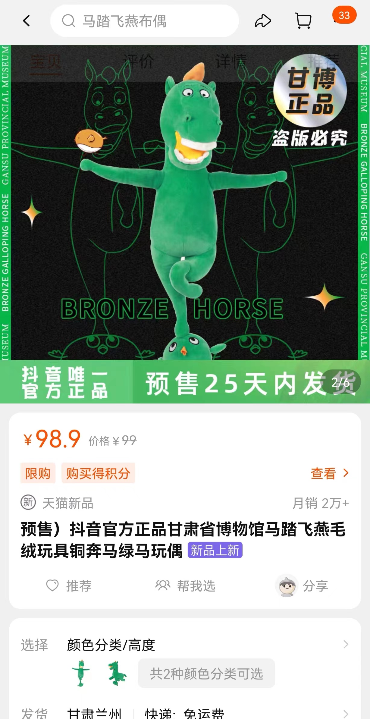 一匹绿马三足腾空,单只蹄子踏着圆润的飞燕,咧嘴露出两排大白牙,憨态可掬的表情和神态令人忍俊不禁。近日,由甘肃省博物馆原创设计的文创产品铜奔马毛绒玩具火爆全网,线上线下均已售罄,预售已排到25天以后。面对网友的热情抢购,设计团队回应称,“缝纫机要踩出火星子了”。
