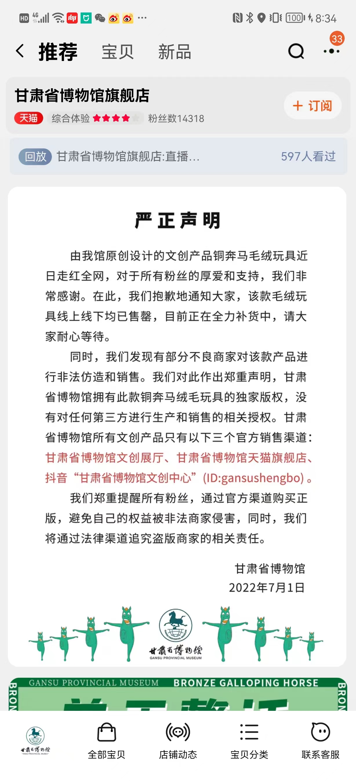 值得注意的是,“马踏飞燕”走红后遭遇了被仿造的烦恼,甘肃省博物馆为此发出“严正声明”,提醒消费者通过官方渠道购买正品,并表示将追究盗版商家的法律责任。热门文创IP往往成为盗版侵权的重灾区,破解山寨之困需要多维度共同治理,形成企业维权与监管机制的合力,引导全社会营造尊重创造、尊重创新的氛围。