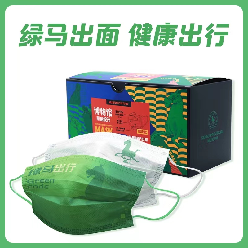其实这并非甘肃省博物馆第一款走红的铜奔马文创产品。从2020年起,甘肃省博物馆文创中心开始推出“神马来了”IP,围绕铜奔马的特点,逐渐推出了一系列自带喜感的文创产品,包括3D立体铜奔马造型头套、“绿马出行”口罩、“绿马飞侠”风筝等。甘肃省博物馆还曾在兰州中川国际机场举行快闪活动,一群头戴铜奔马头套的演员跳着舞,向候机乘客分发铜奔马文创口罩,让文物走下神坛与大众一起“玩梗”,实现破圈营销。