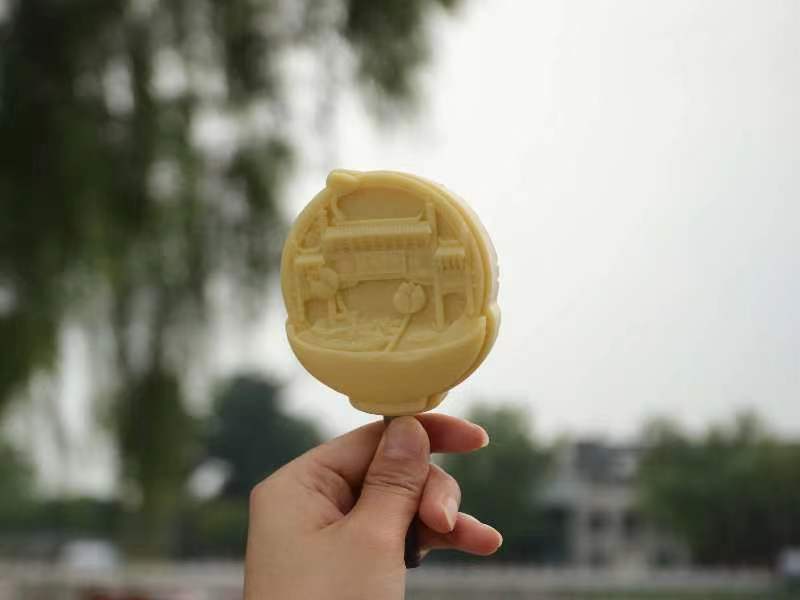 记者注意到,这款文创冰淇淋呈圆形,底部造型为游船,“托”起荷花市场“牌楼”,周围点缀荷花和波浪,将什刹海的标志性元素浓缩起来。