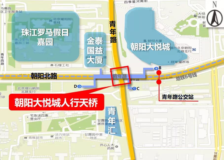 这座“口”字形人行天桥就位于朝阳区朝阳北路与青年路路口,连接朝阳大悦城商圈周边公交、地铁、慢行系统。桥梁宽5米、长约245米,同步建设人行梯道、扶梯、垂直电梯等附属工程。