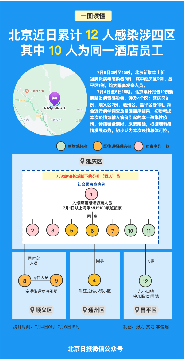 记者梳理发现,12例感染者中10人为同一酒店员工,居住在延庆、通州、昌平三区,顺义2例感染者曾到访过该酒店、系同时空人员。