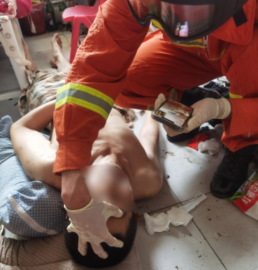 屋内一位50多岁的男子躺在地上,他的口鼻周围覆盖着呕吐物及白沫,还出现了抽搐、大小便失禁等症状,情况紧急。为防止病人窒息,卫生员张守坤立即使用敷料布为男子进行清理擦拭,清除口鼻周围异物,帮助男子将姿势由平躺变为侧卧。担心地上凉,消防员们还在男子身下垫上了被单。