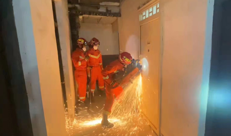7分钟后,5位消防员到达现场。铁门上着锁,可屋内病人情况危急,于是指挥员下达了破门指示。抢险车车长陶宏贺使用砂轮无齿锯对门进行破拆,一时间火光四射,只用了20秒,门就被打开了。
