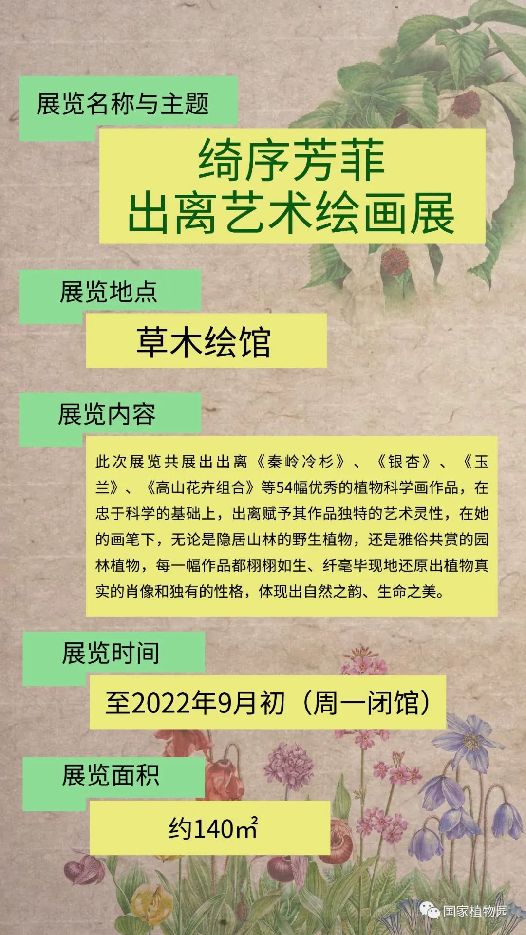 “草木入绮绘,红紫斗芳菲”,让我们一同走进出离笔下植物科学画的世界,感受科学与艺术的完美融合,理性与感性的精巧平衡,一睹芳菲佳境,领略每种植物别具一格的生命姿态,增进我们对植物与人类关系的理解,提高对植物和环境的保护意识。
