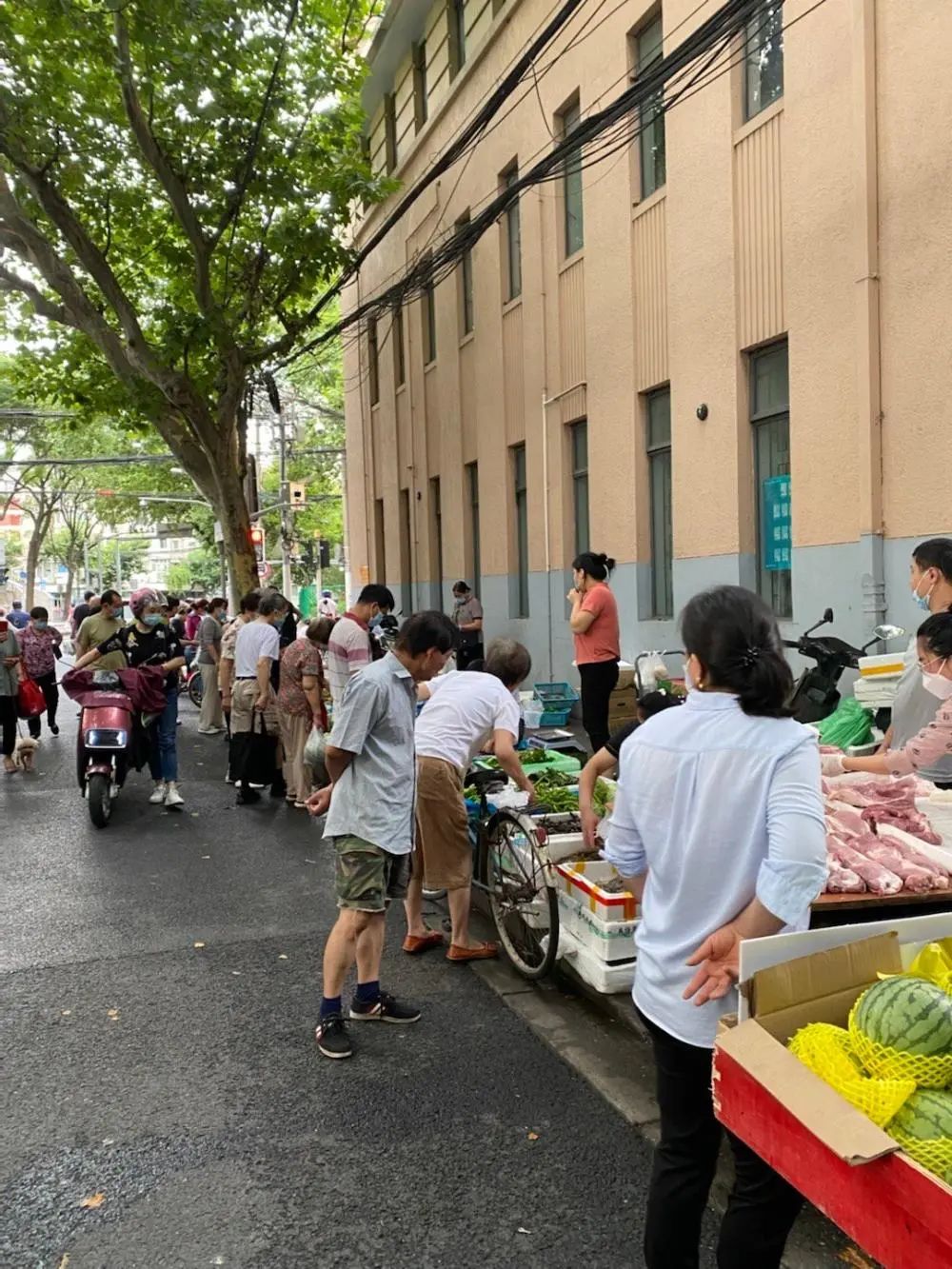 事实上,申城目前未开门的菜市场还不少。如宛南三村居民陈女士也向解放日报·上观新闻互动平台反映,称家附近的“双峰菜场”至今也未开门,清早摊贩们都在双峰路、华容路摆摊,附近居民都聚集在路边买菜,现场乱糟糟的。