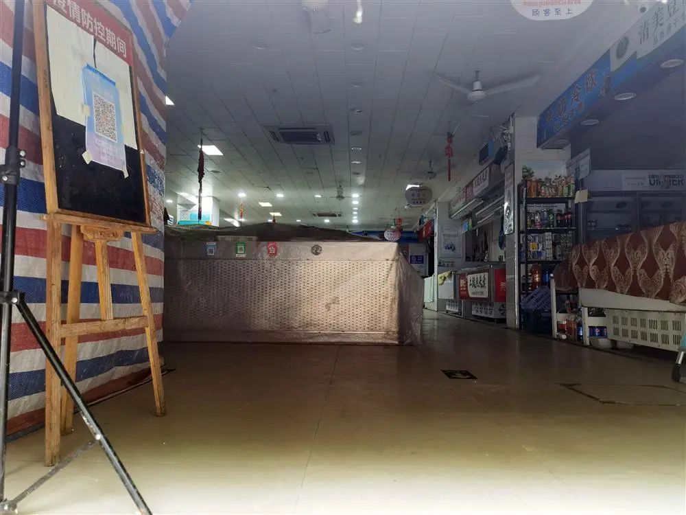 入口左侧是沿街的一家点心店和生鲜店门店,两家店里外门窗均被彩条布遮挡得严严实实。蹲下来从卷帘门下方半米高的缝隙往菜场内看去,可以看到里面的摊位上仍覆盖着塑料膜。但菜场入口左侧处的小黑板上,一张“场所码”已张贴妥当,似乎已经做了一些营业的准备。