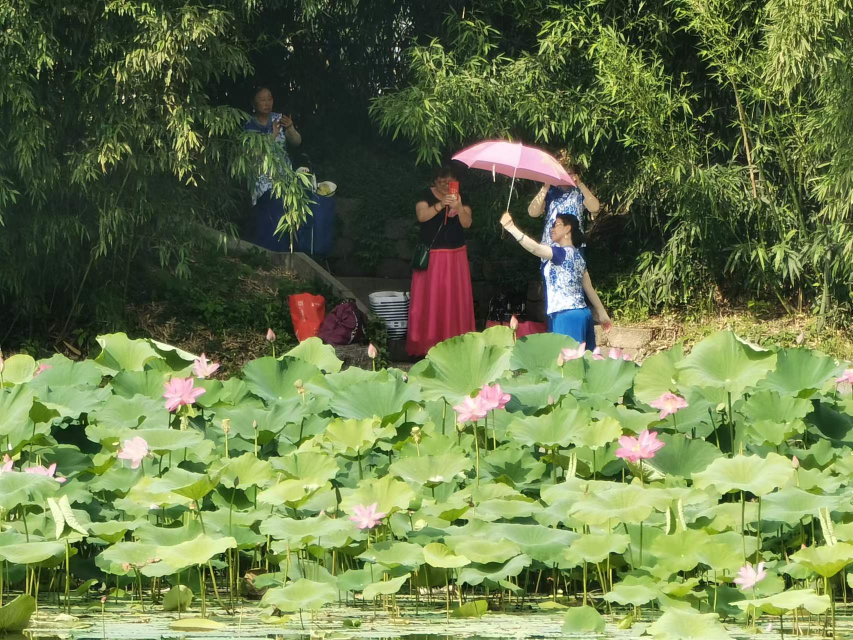 7月11日,游客登上紫竹院公园荷花渡景区摇橹小木船,在800米长的航道内缓缓前行,近距离欣赏沿途碧绿丛中盛开的各色荷花。在盛夏时节,来紫竹院公园乘船观荷花,成为京城避暑休闲的好去处。