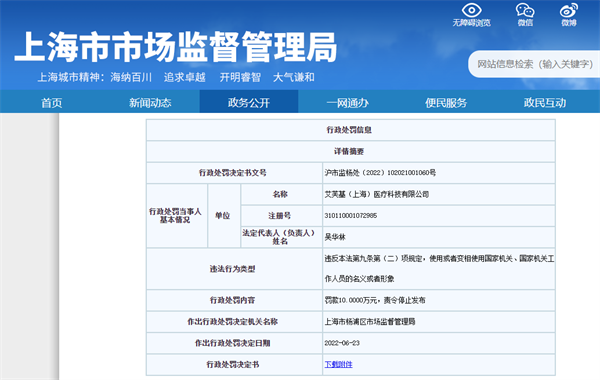 近日,艾芙基(上海)医疗科技有限公司因在广告中使用或者变相使用国家机关、国家机关工作人员的名义或者形象,违反《广告法》,被上海市杨浦区市场监督管理局对该公司罚款10万元,并责令停止违法行为。