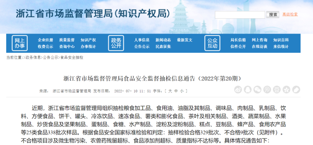 近期,浙江省市场监督管理局组织抽检25类食品338批次样品,检出不合格样品9批次。不合格样品涉及:标称义乌嘉盛食品有限公司生产的原味姜红糖、标称宁波雅布食品有限公司生产的奶香味山核桃碎仁(手抓包)、标称杭州临安恒枫食品有限公司生产的开心果仁、标称浙江兴品茶叶有限公司生产的枸杞、杭州梅龙茶文化有限公司生产的九曲红梅(红茶)、标称浙江乡妹子食品有限公司生产的盐焗味蛋、标称浙江东阳童氏酒业有限公司生产的黄酒等。