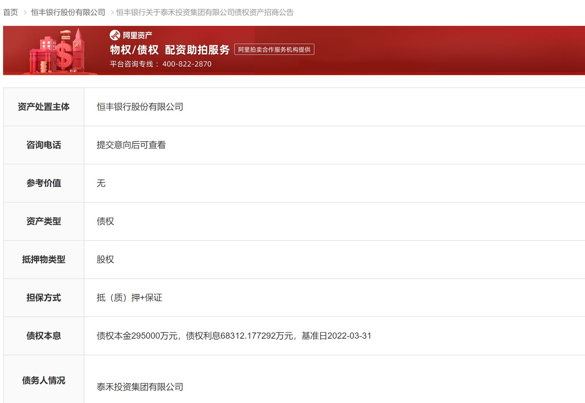 近日,根据阿里拍卖网站消息,恒丰银行股份有限公司近期将“泰禾投资集团”的债权资产挂网招商,涉及的债权本息合计为36.33亿元,基准日为2022年3月31日,抵押物为泰禾投资集团100%股权。