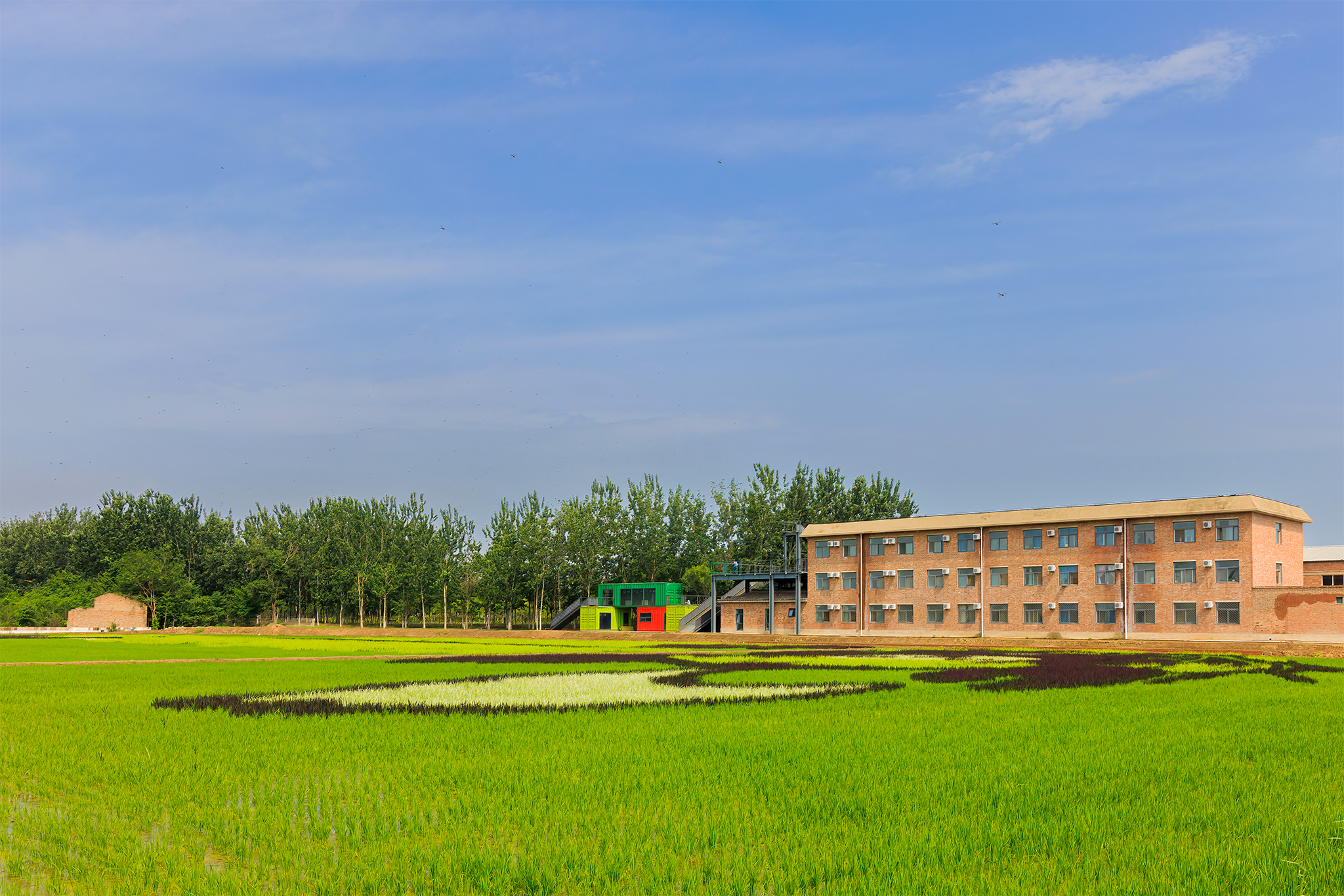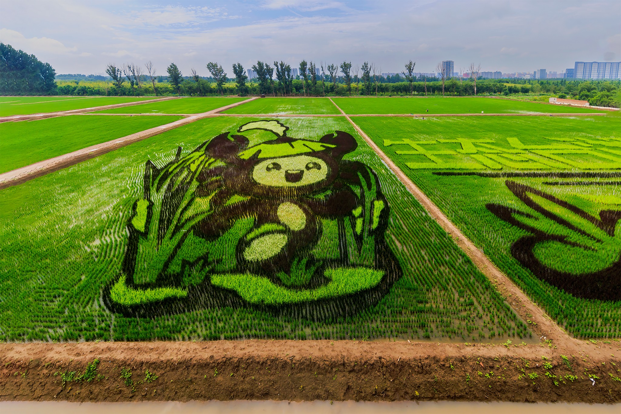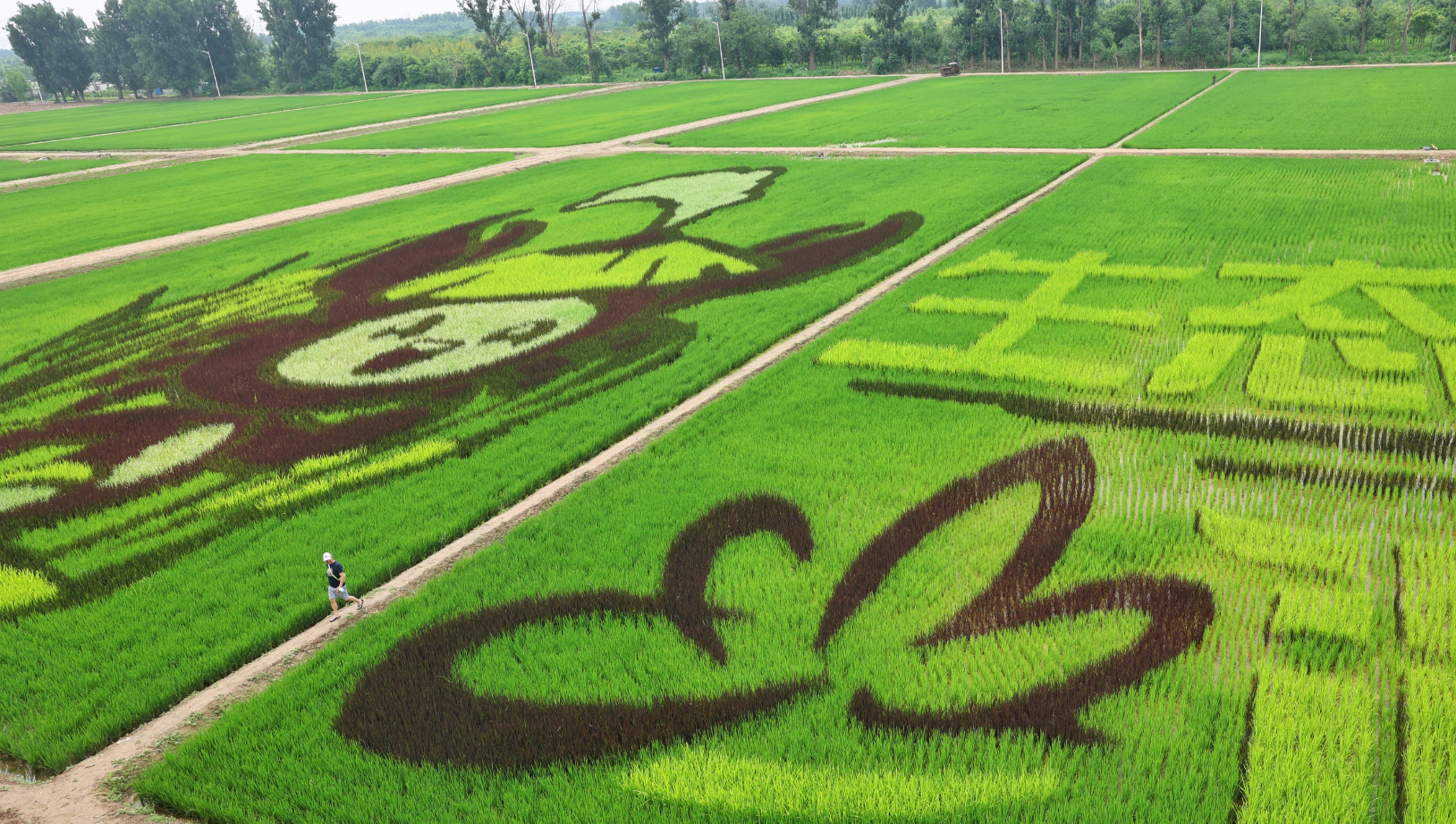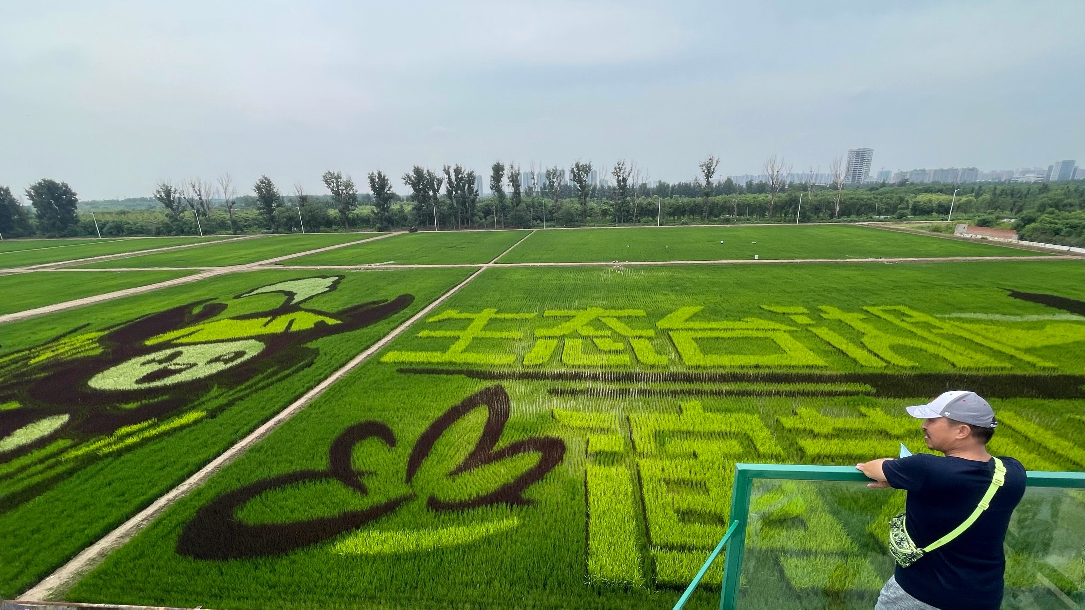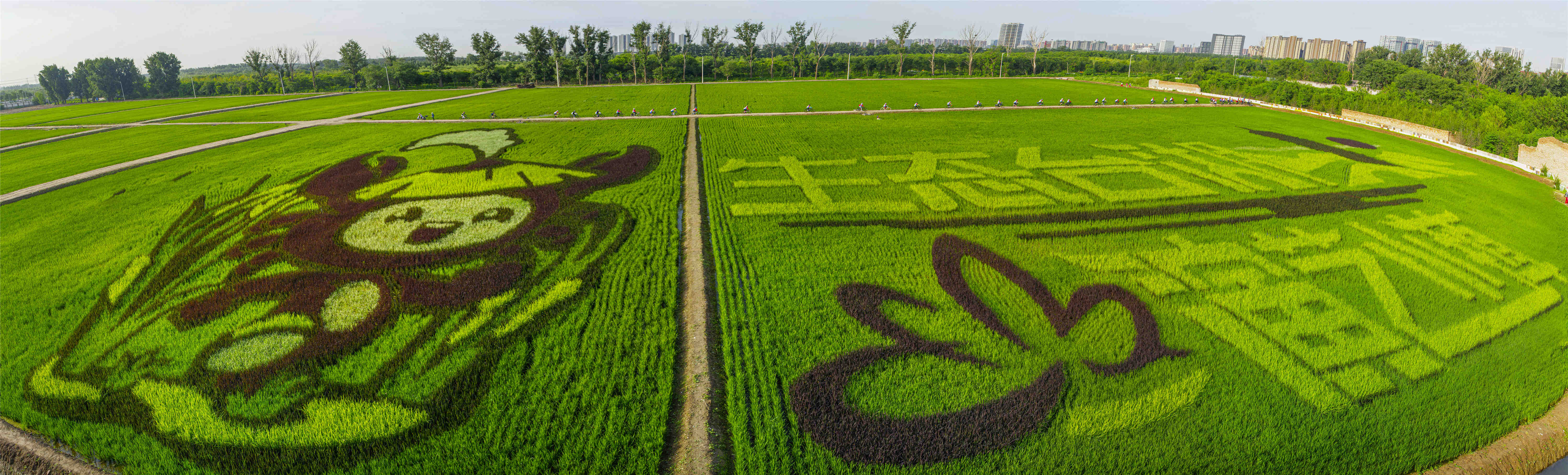 登上观景平台,320亩稻田尽收眼底,其中50亩是由五彩水稻种植形成的巨幅稻田画。图案左侧为农场形象代言人“稻小蟹”,头顶戴着一根稻穗,整体包含了螃蟹、稻穗、草帽等元素,活泼童趣的形象俏皮可爱。右侧则是用浅色水稻绘就的“生态台湖 演艺小镇”艺术大字,点缀以通州运河、燃灯塔、花朵等图形,体现了五彩稻田是在退耕还林背景下立足城市副中心建设发展打造的生态田园。