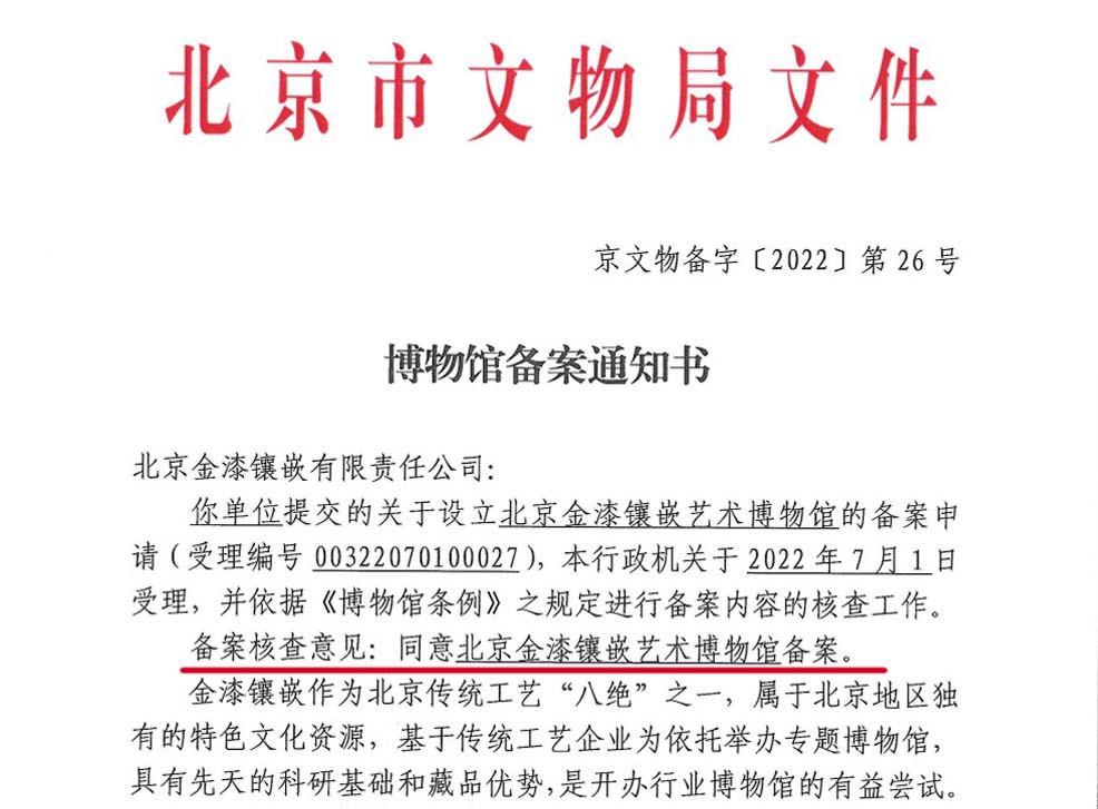北京金漆镶嵌艺术博物馆最近经北京市文物局审核,正式备案。目前,该馆的改造、展陈已接近尾声,有望8月对观众开放。